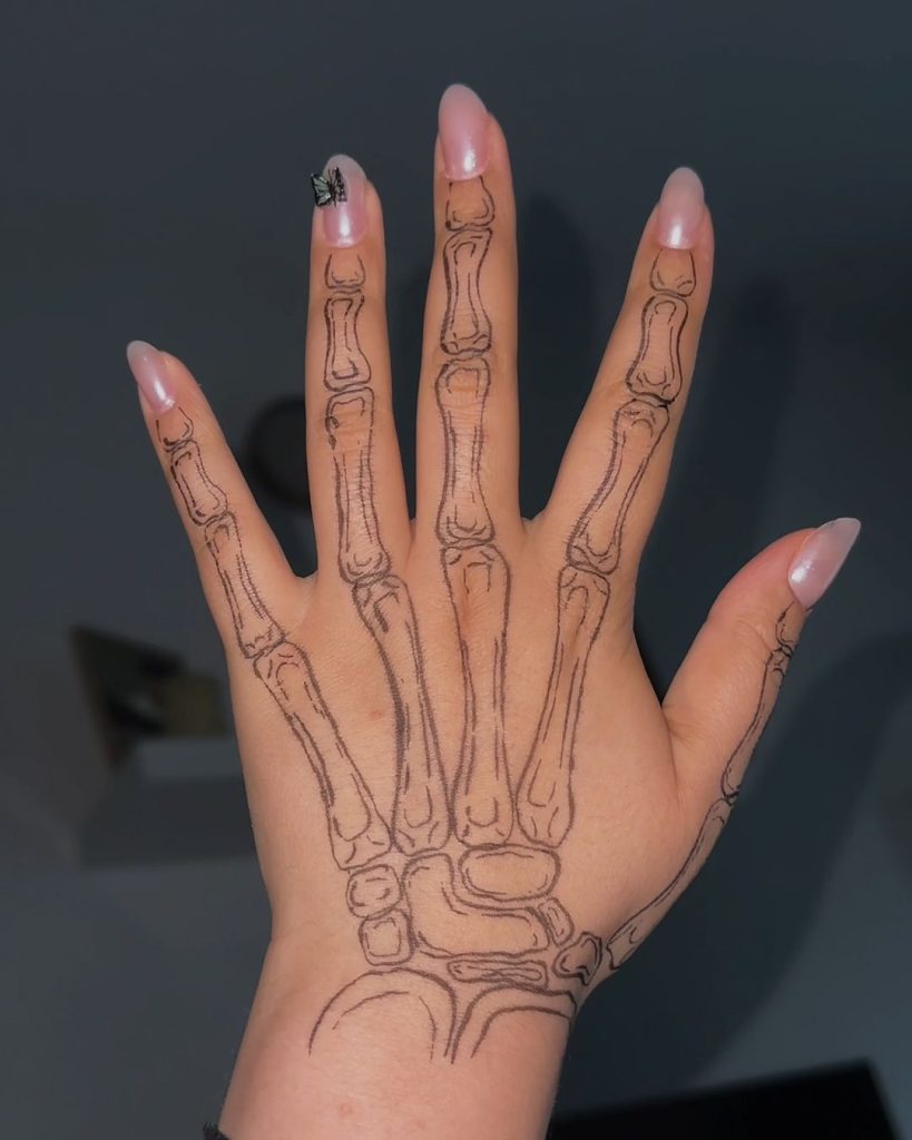 This tattoo features a simple, line-drawn outline of hand bones that mimics an x-ray view of the skeleton beneath the skin. Each bone is carefully outlined on the fingers and hand, creating a striking, anatomical look without shading or extra detail. The minimalist style gives it a clean, edgy appearance, perfect for anyone wanting a subtle yet eye-catching skeletal design.