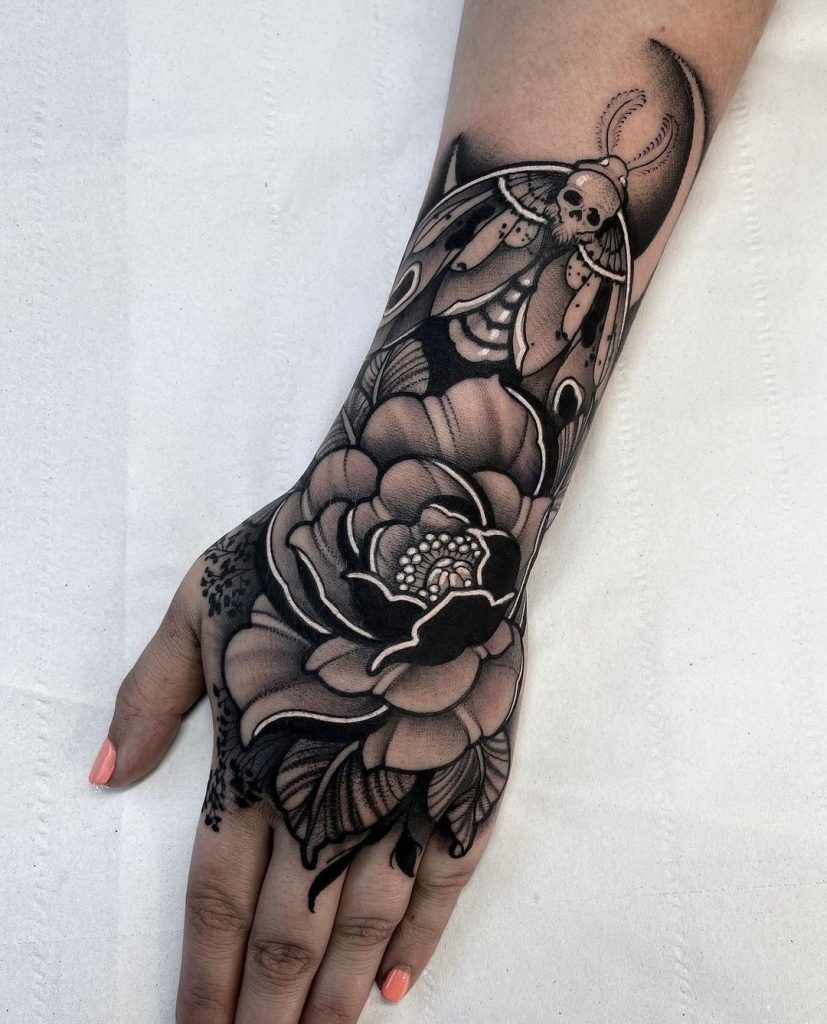 This tattoo on the hand features a bold, dark flower that covers the top of the hand, with detailed shading that adds depth to each petal. Above the flower, a death’s head moth with a small skull design on its back adds a mysterious, gothic element. The combination of the delicate floral design and the eerie moth creates a striking balance between beauty and darkness.