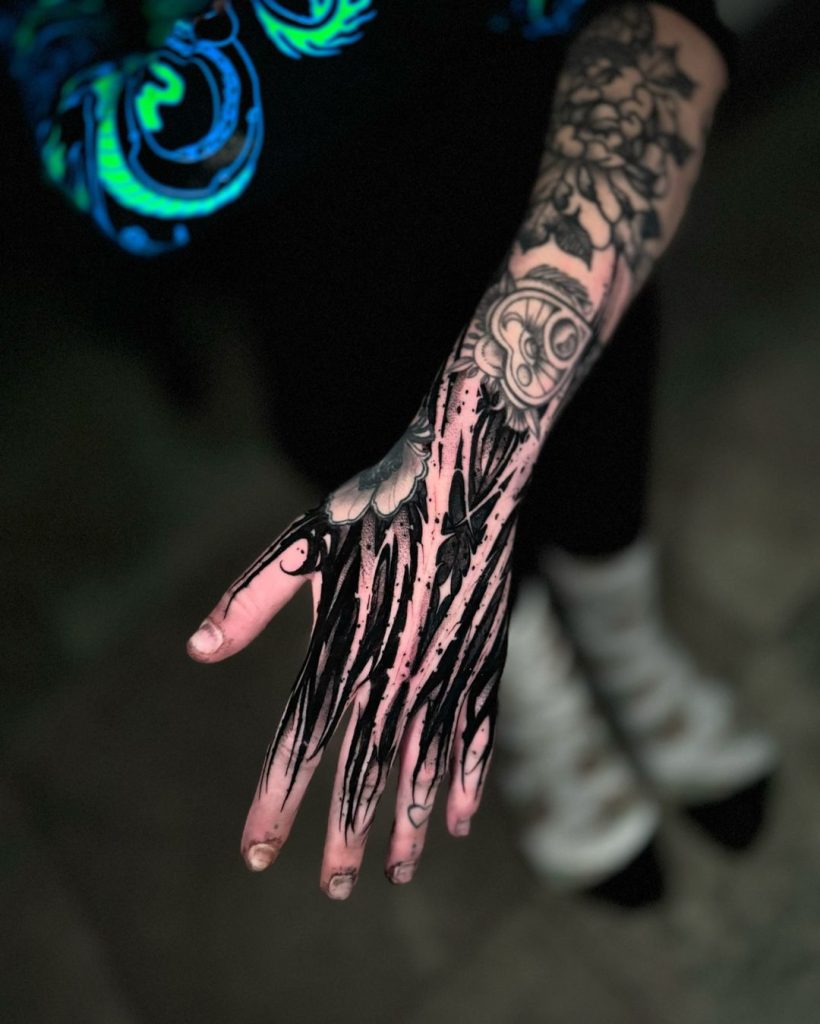 This striking hand tattoo features black ink dripping down the fingers, creating a bold, paint-like effect. The flowing black streaks blend with detailed floral elements on the wrist, adding texture and depth. Covering the entire hand and extending from the forearm, this design has a dramatic, edgy vibe, giving the impression of ink melting down the skin.