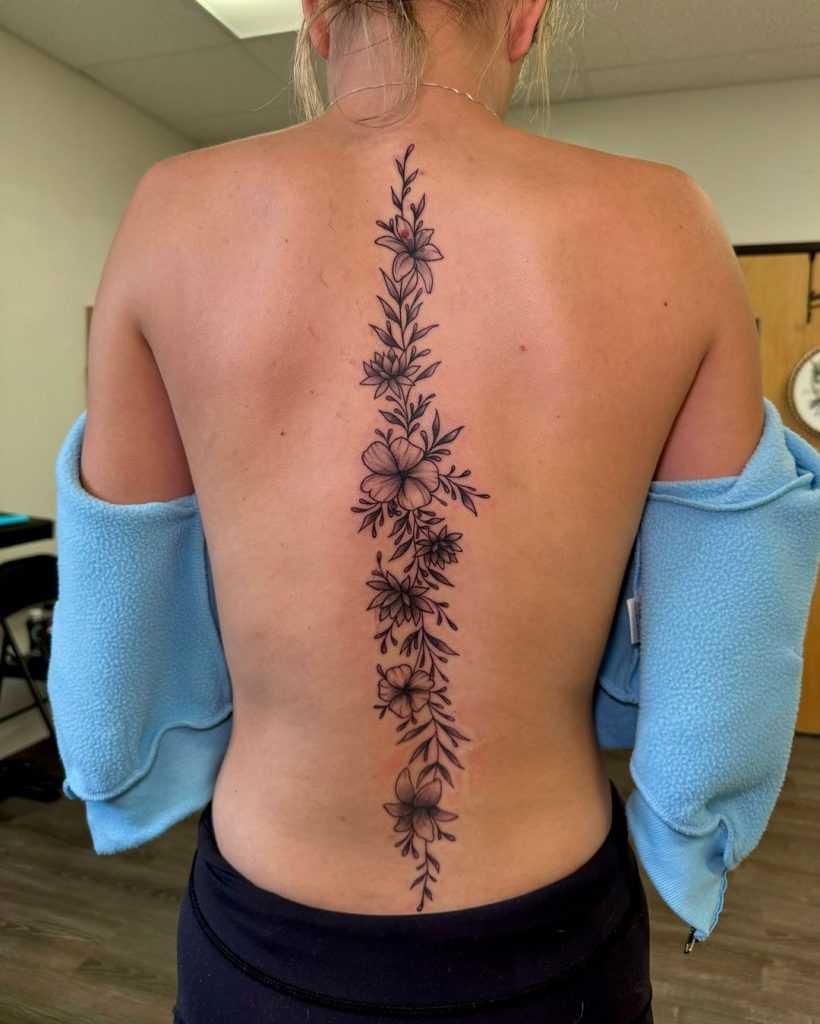 This elegant tattoo features a vertical line of flowers and leaves that flows gracefully down the spine. Each bloom is detailed with soft shading, giving the floral arrangement a gentle and natural look. Positioned along the center of the back, this design adds a touch of femininity and harmony, beautifully accentuating the natural curves of the body.
