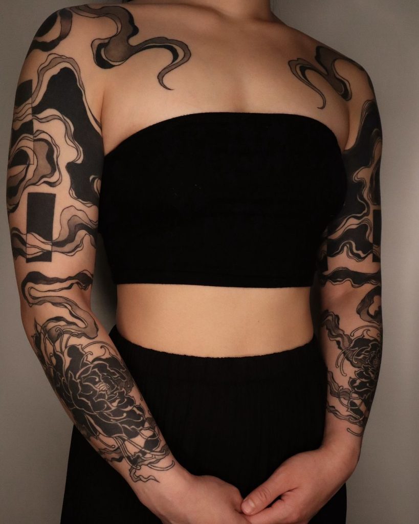 This tattoo design covers both arms and shoulders with flowing, smoke-like patterns and dark, abstract shapes. The arms feature intricate floral elements intertwined with the smoky lines, creating a dynamic, organic feel. The combination of bold black shading and soft, wavy contours gives the piece a harmonious, yet mysterious aesthetic that wraps gracefully around the upper body.