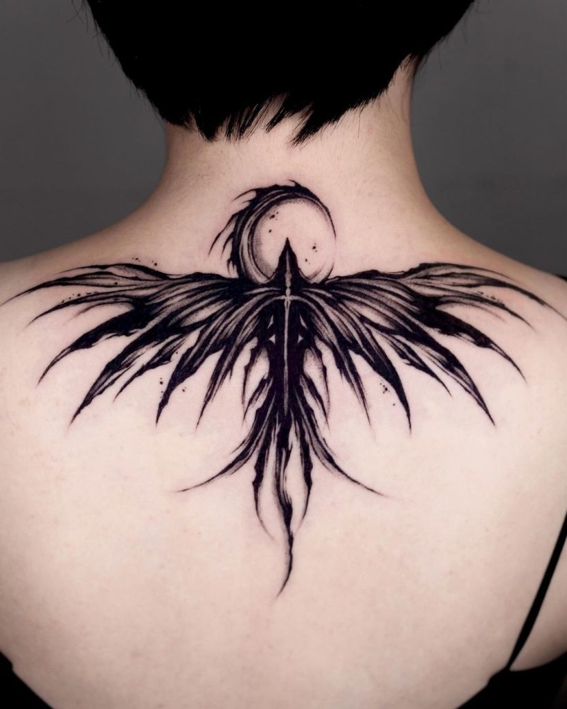 This striking tattoo features a set of dark, jagged wings spread across the upper back, with a shadowy crescent moon resting above them. The design combines both power and mystery, making the wings look almost alive with energy. This piece adds a dramatic, ethereal touch right below the neck.