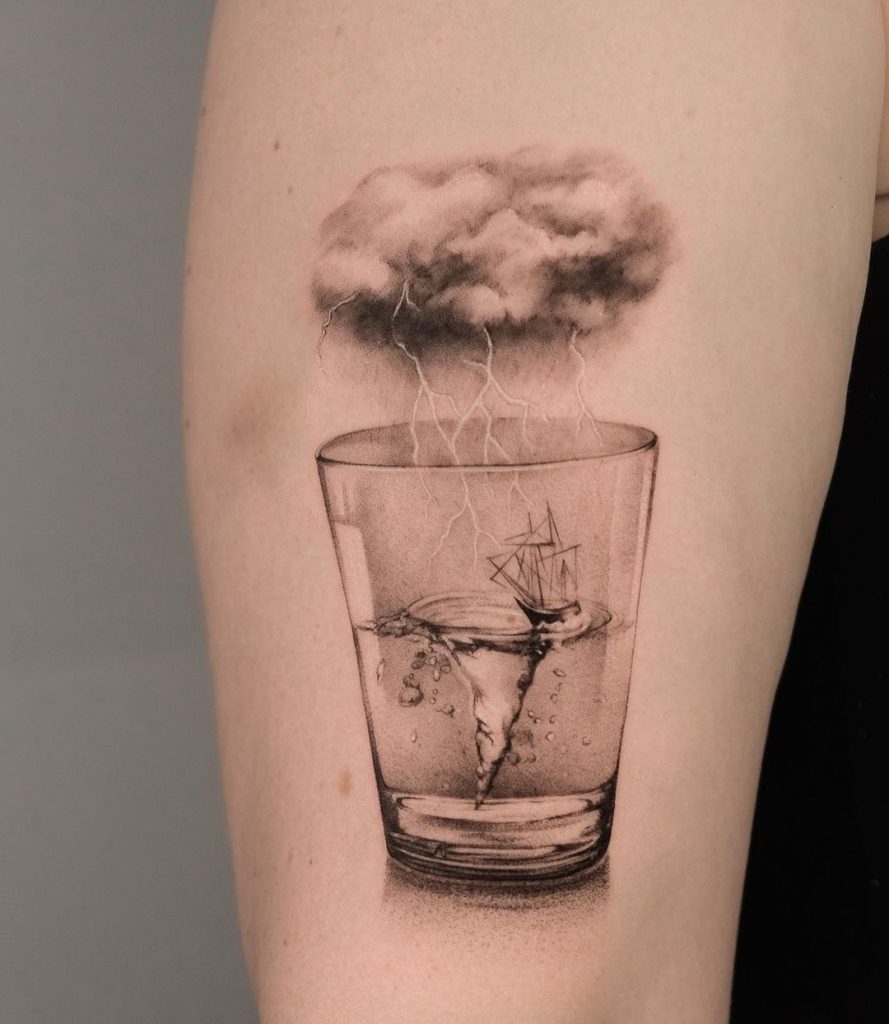 This imaginative tattoo shows a glass filled with water, but inside it, a tiny ship is caught in a swirling tornado, with a stormy cloud and lightning striking from above. Located on the upper arm, the design creates a surreal vibe, making it look like an intense storm is contained within the glass. It s a cool mix of realism and fantasy, capturing the feeling of inner chaos in a calm setting.