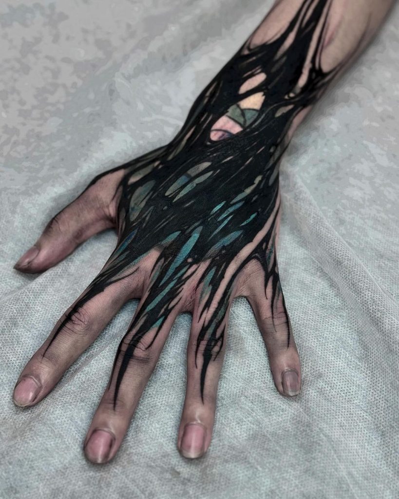 This tattoo flows across the hand and fingers with dark, ink-like tendrils that resemble paint dripping and spreading. Hints of blue, green, and muted pink peek through the black areas, adding a subtle, mystical quality to the design. The abstract style gives a unique, almost fluid appearance, creating a mesmerizing effect as it merges with the natural lines of the hand.