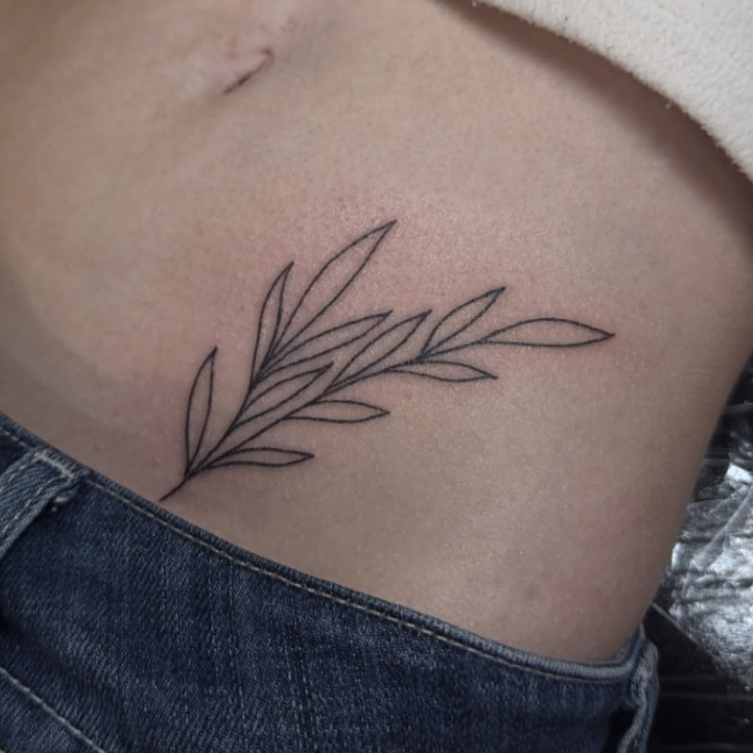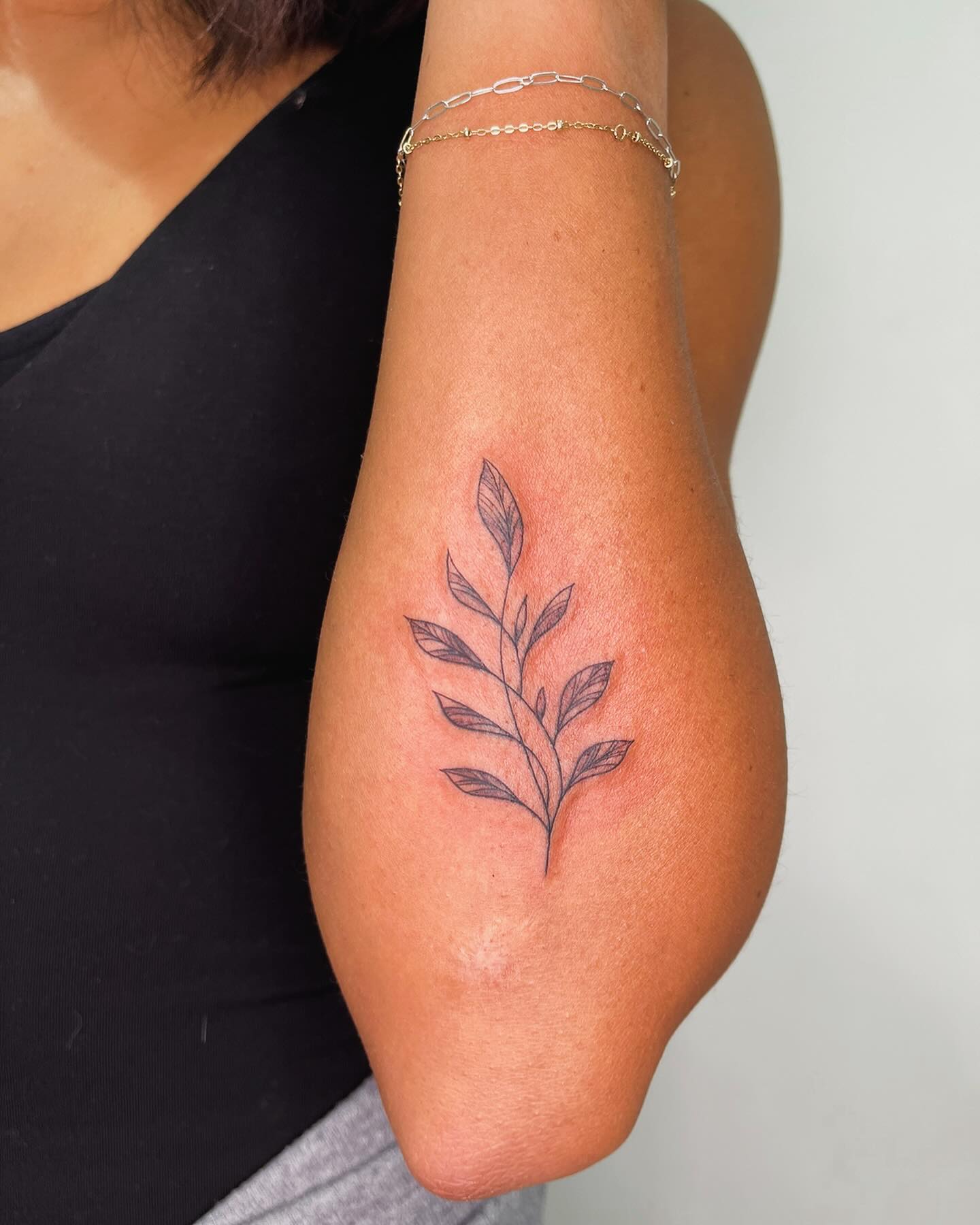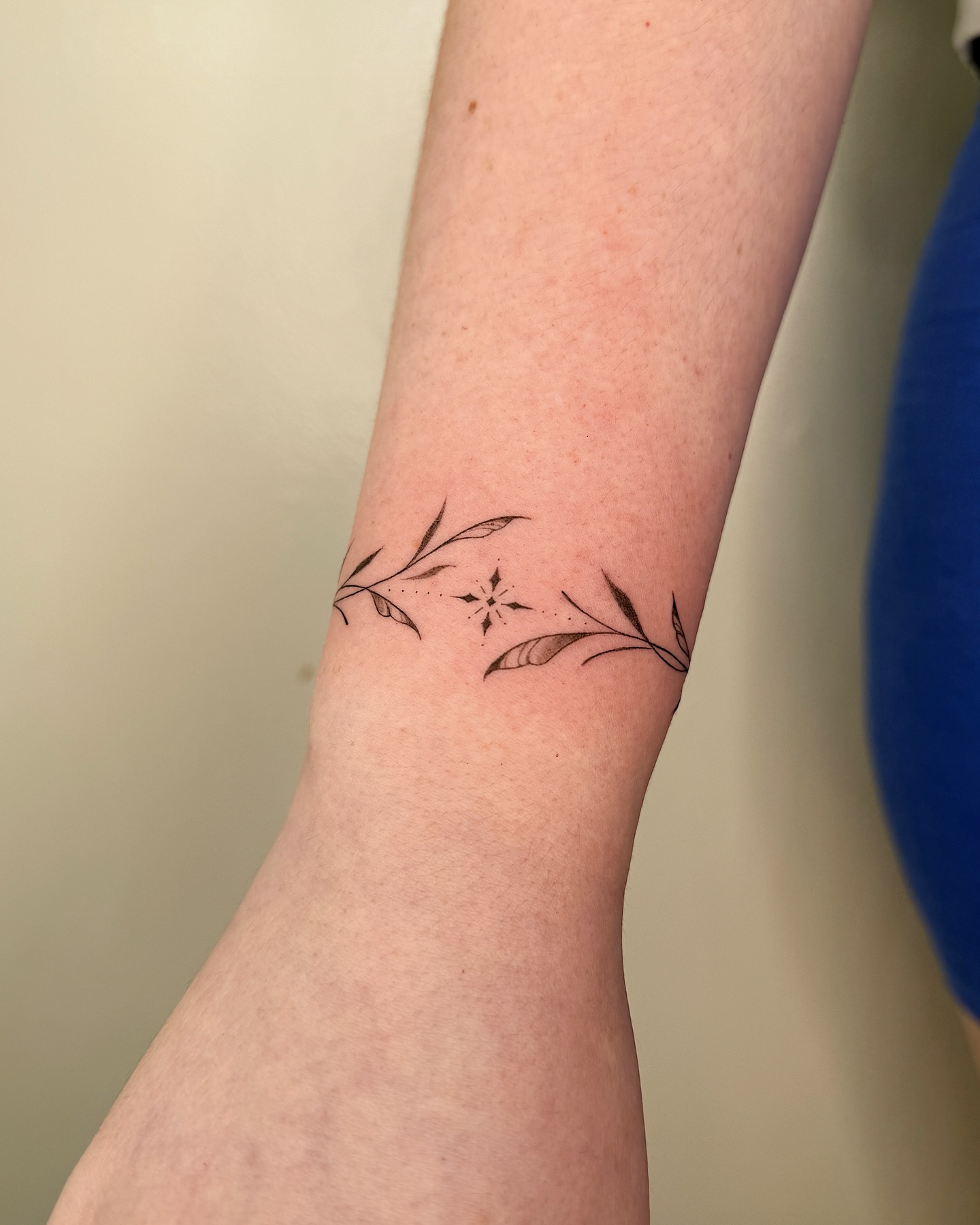 The tattoo features slender, intertwining leaves that create a graceful frame around a starburst design.