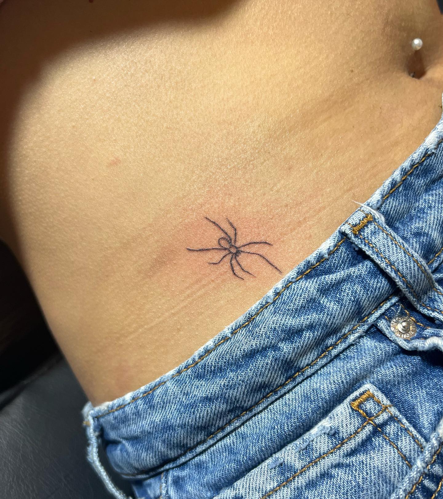 The delicate spider tattoo features thin, precise lines that create a subtle yet intriguing image.