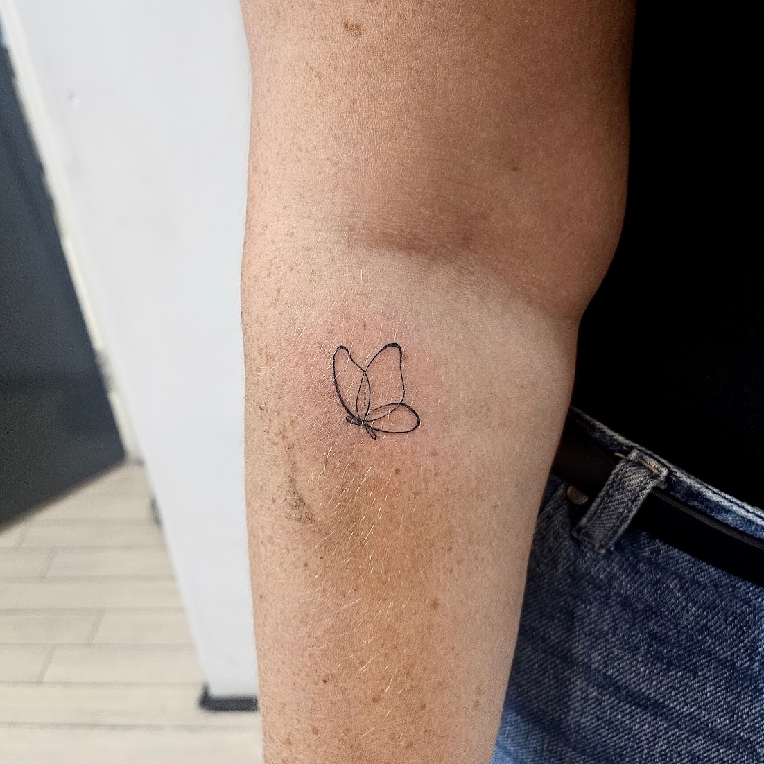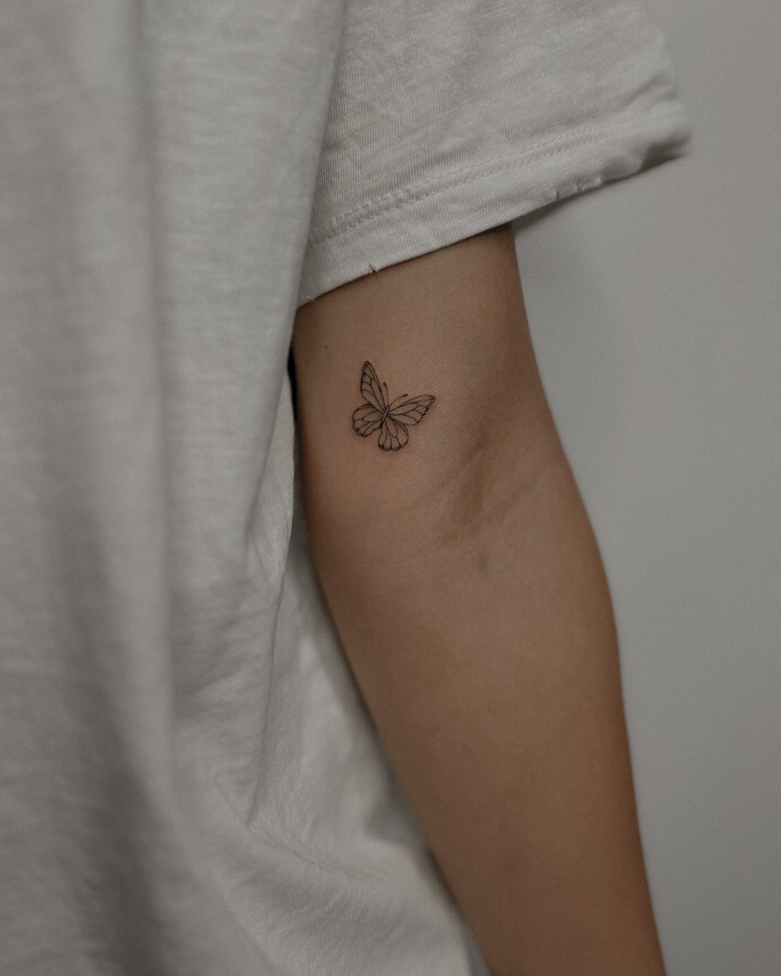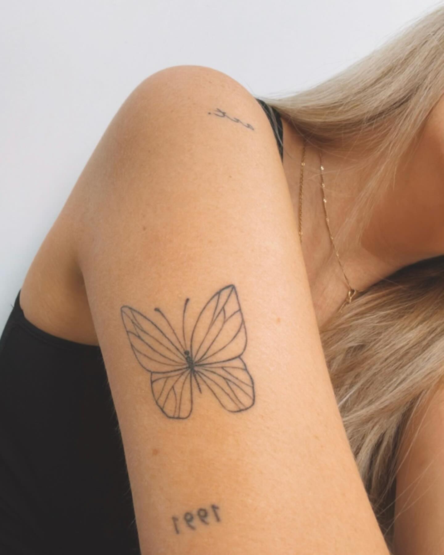 Delicate butterfly tattoos adorn the elbows, showcasing fine line work and simple detailing.
