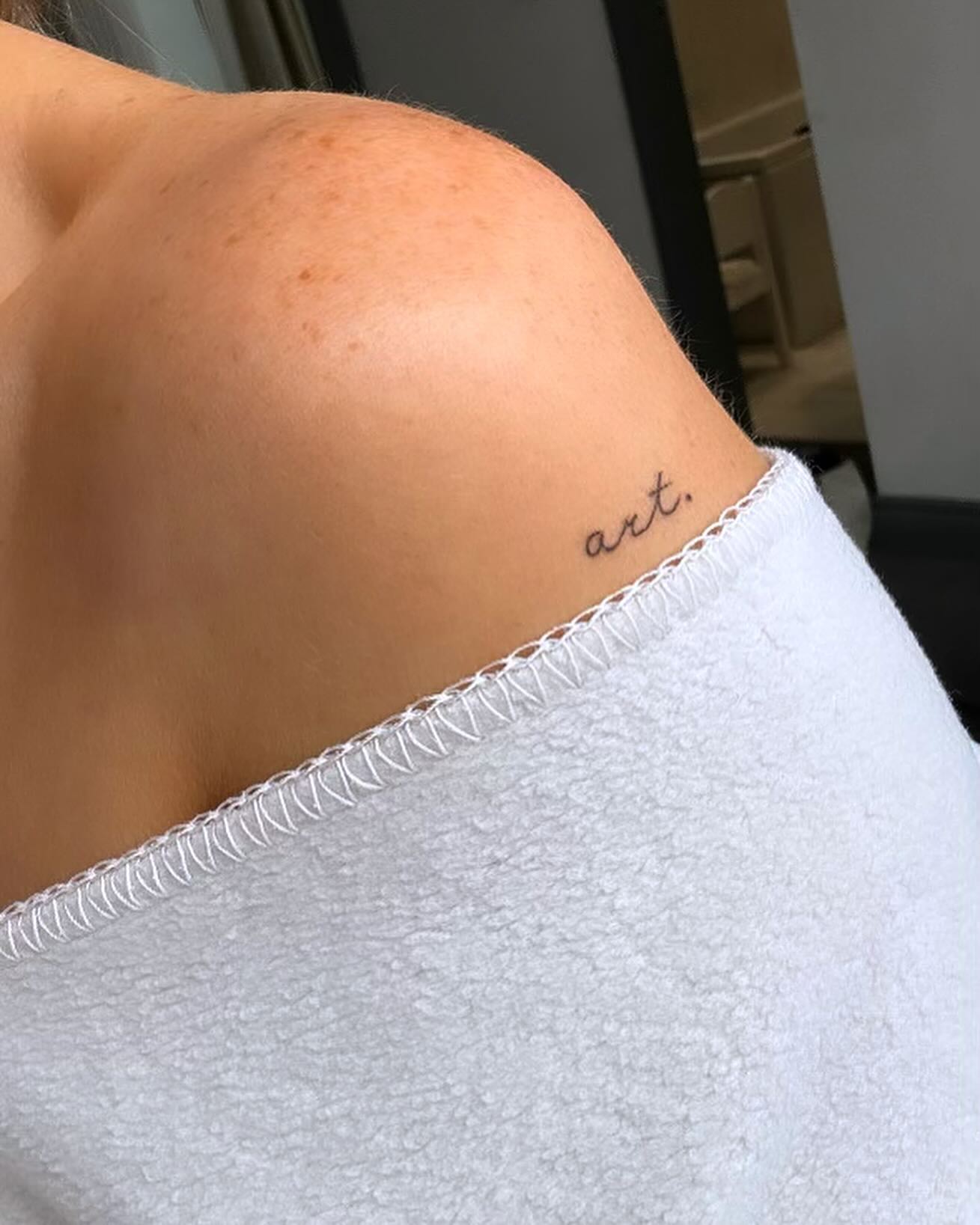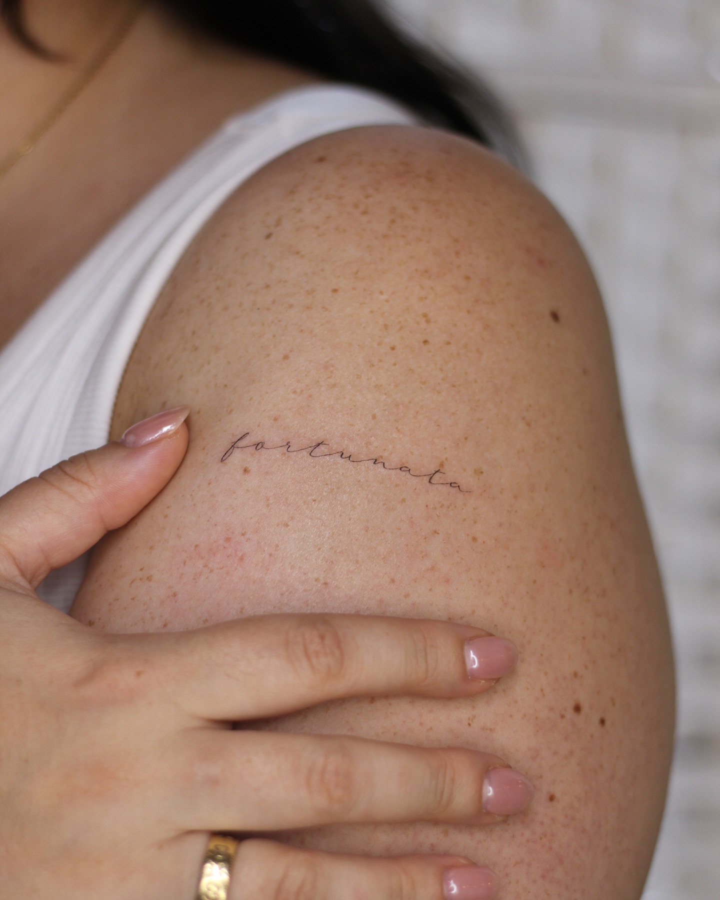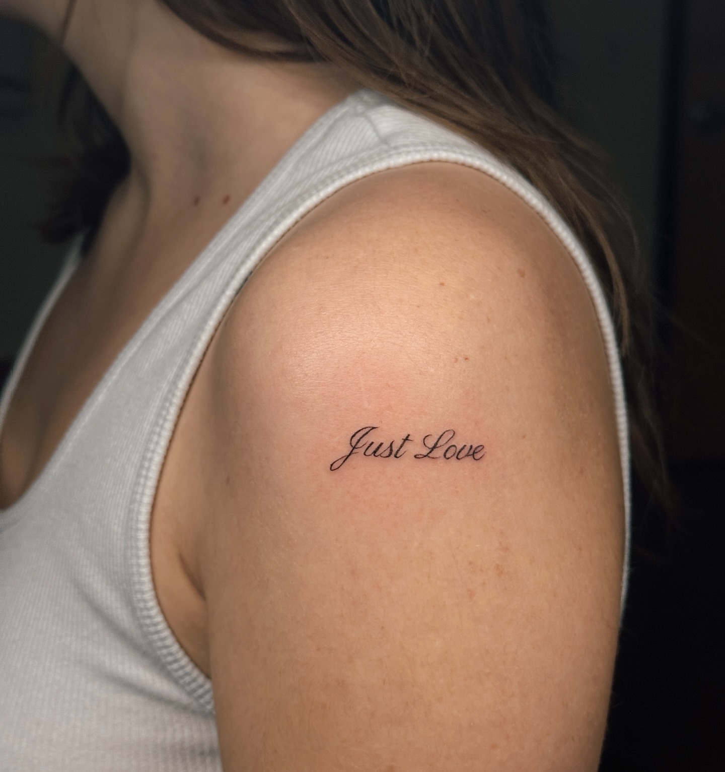 The tattoo features a simple yet elegant handwritten phrase that flows gently across the shoulder area.