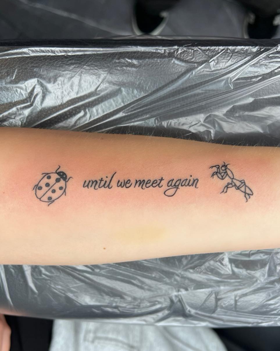 A ladybug and the phrase “until we meet again” create a gentle and personal tattoo.