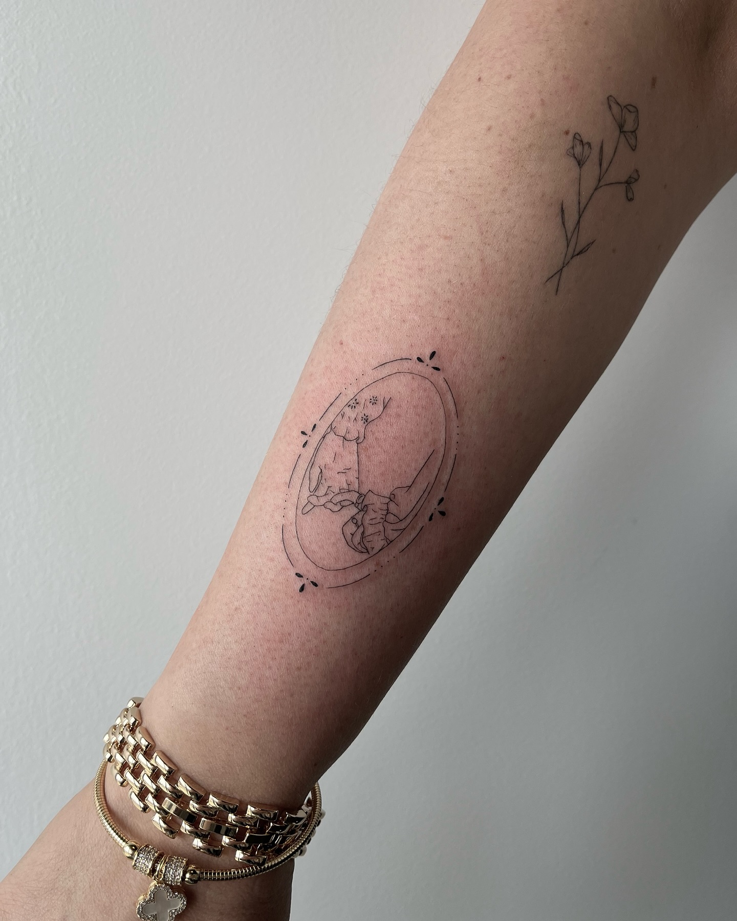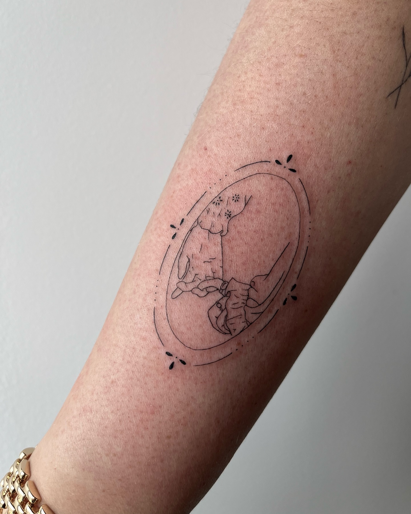 The tattoo features two hands gently intertwined within a delicate circular outline.