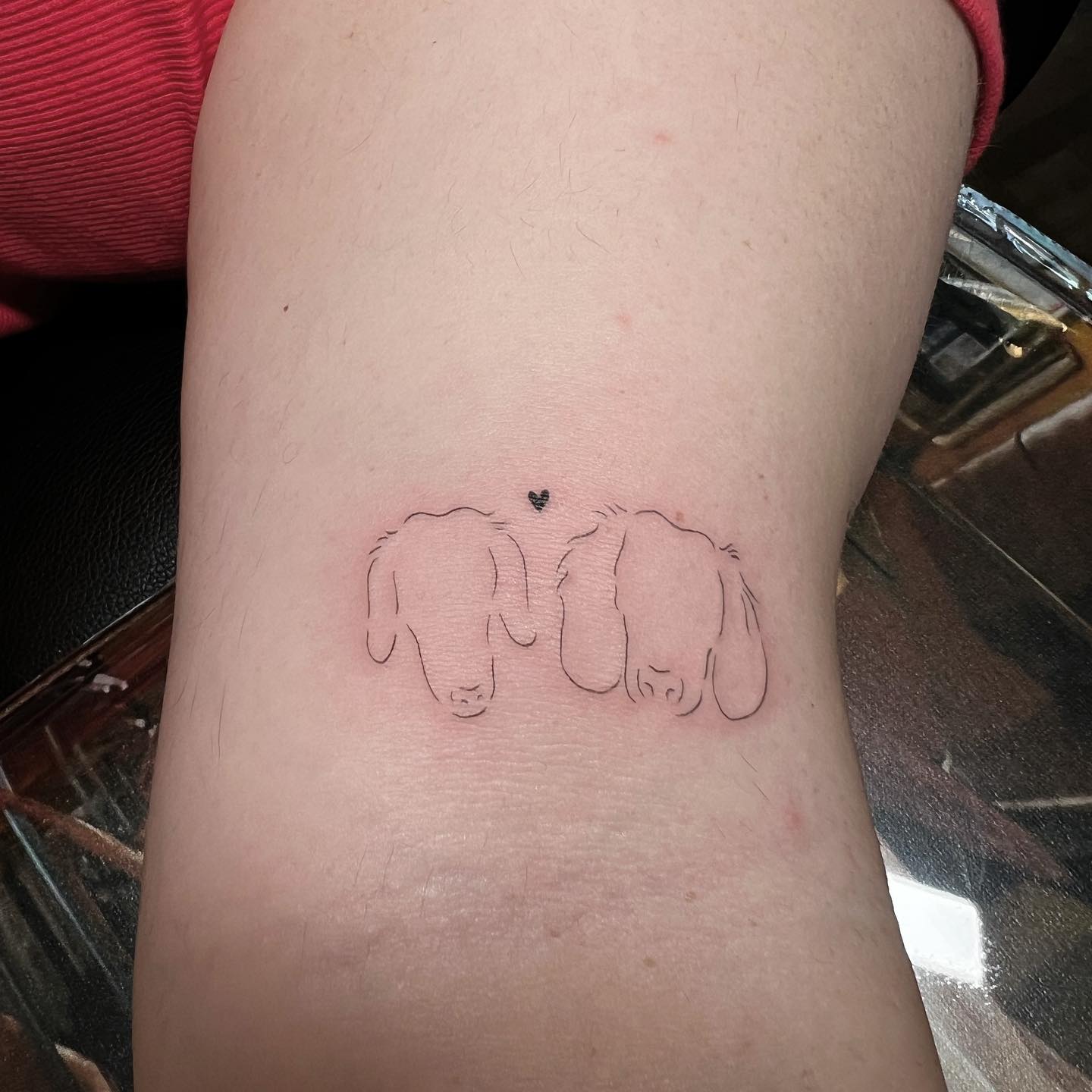 The tattoo features two simplistic dog faces positioned closely together, connected by a small heart above them.