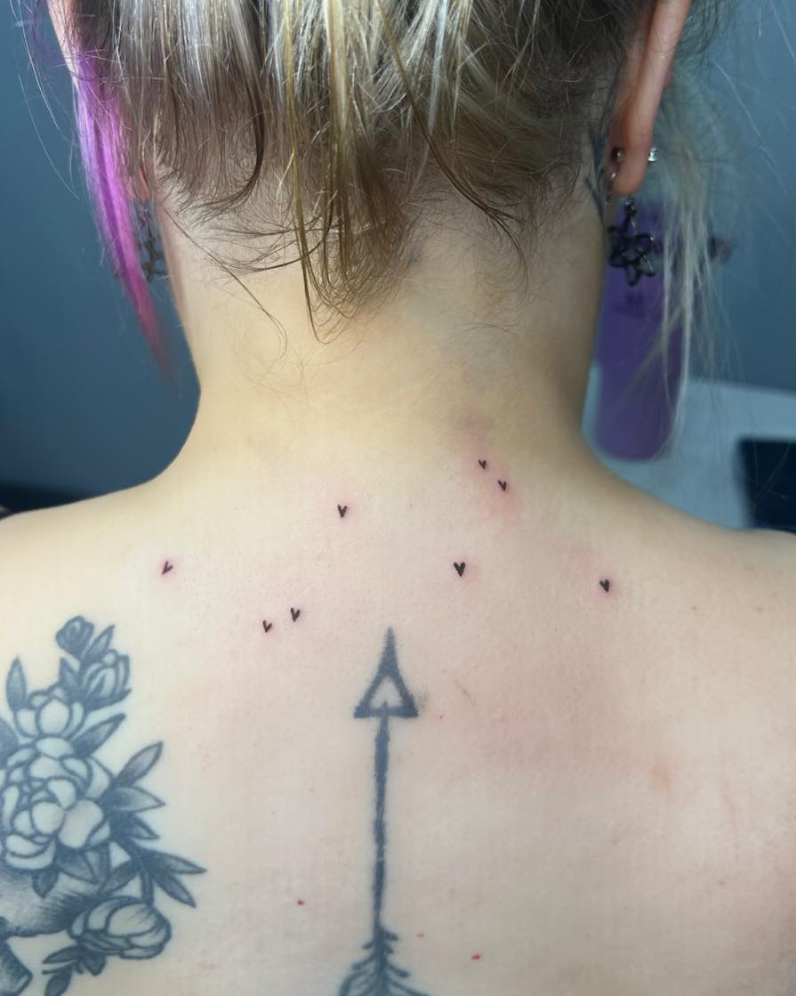 Small heart shapes are scattered delicately across the upper back, creating a light and playful design.