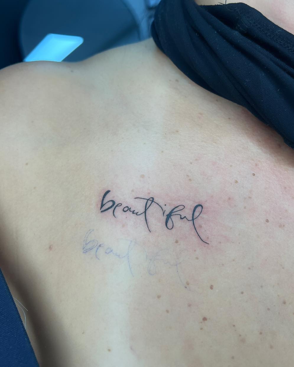 The tattoo features a flowing script that spells out the word “beautiful,” showcasing a delicate and artistic style.