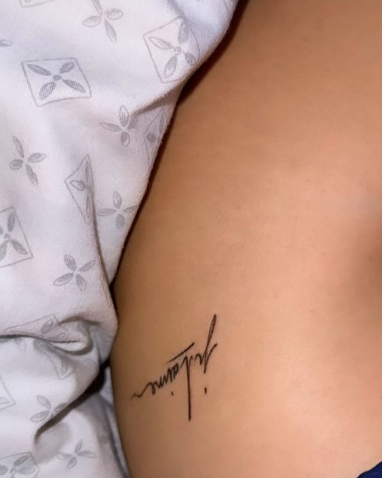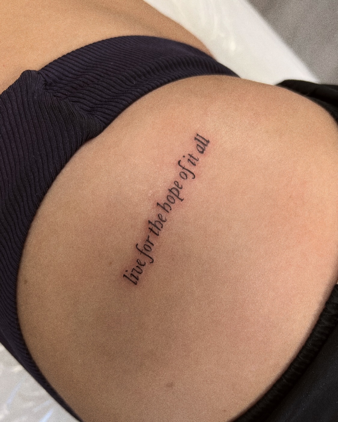 A delicate phrase inked along the ribcage draws attention with its elegant font.