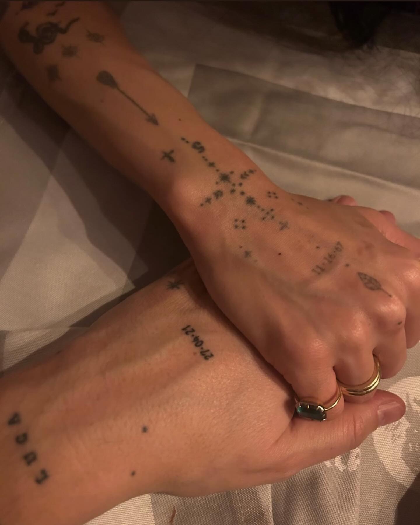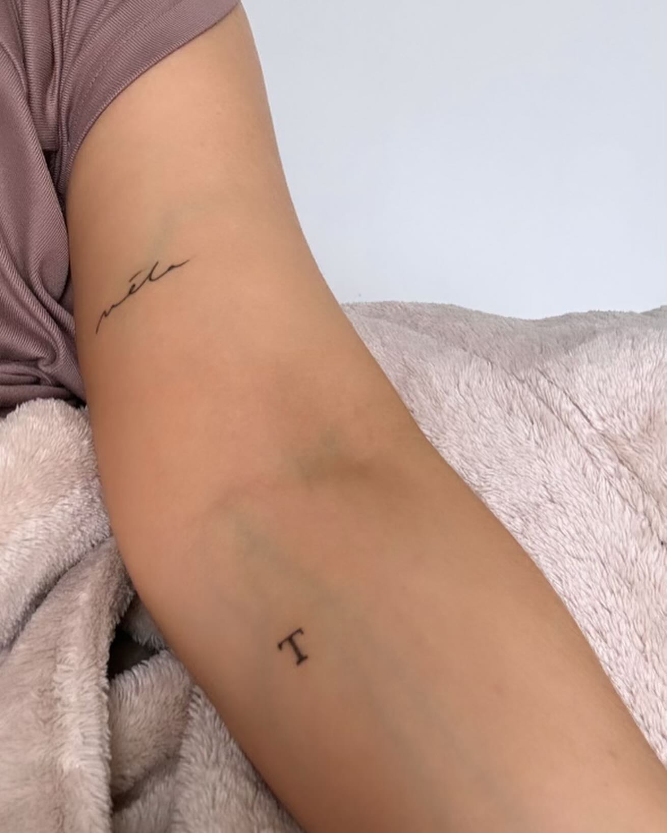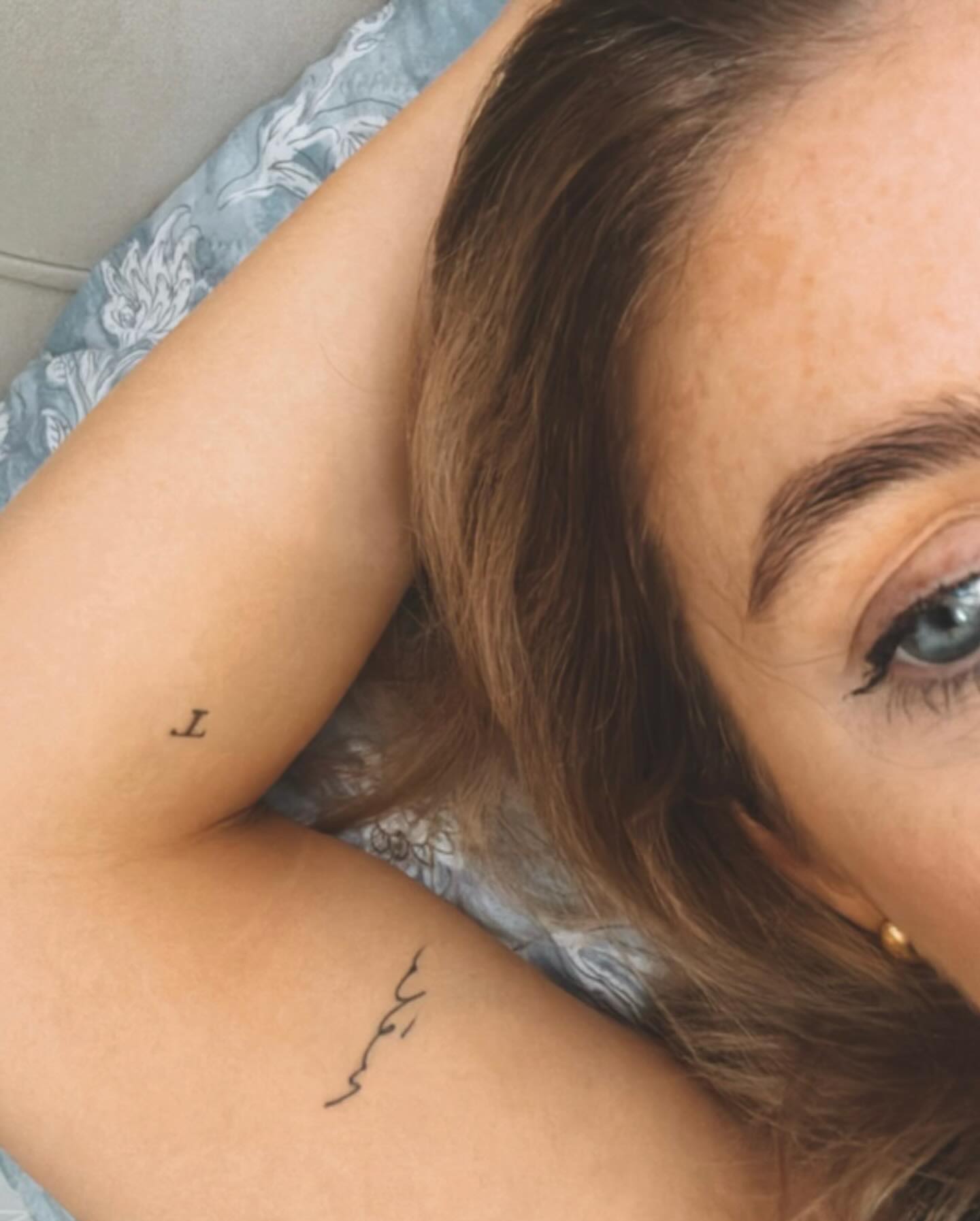 The image features delicate tattoos consisting of a simple letter and a flowing line design on the arms.