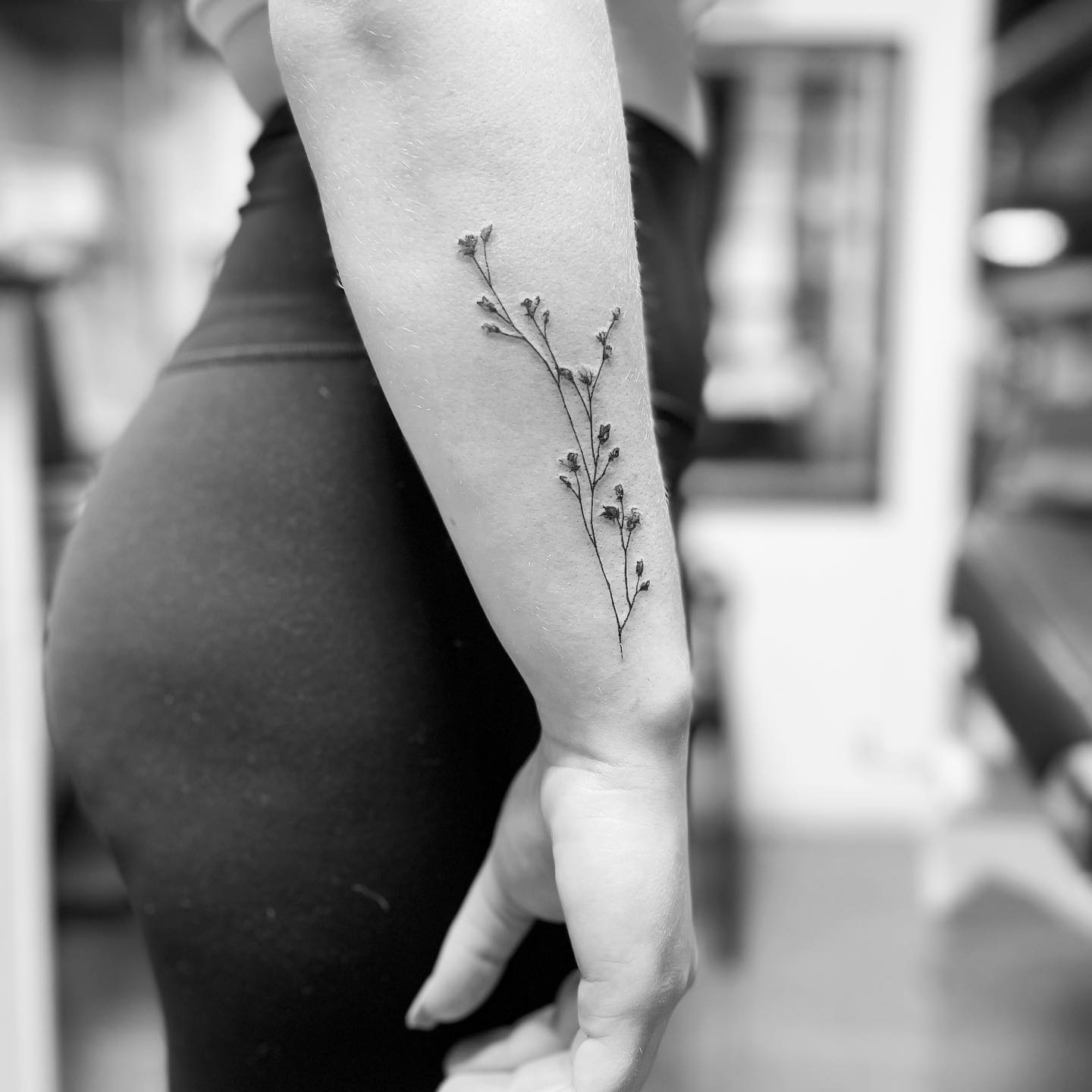 A slender floral branch tattoo features tiny buds and leaves elegantly winding along the arm.