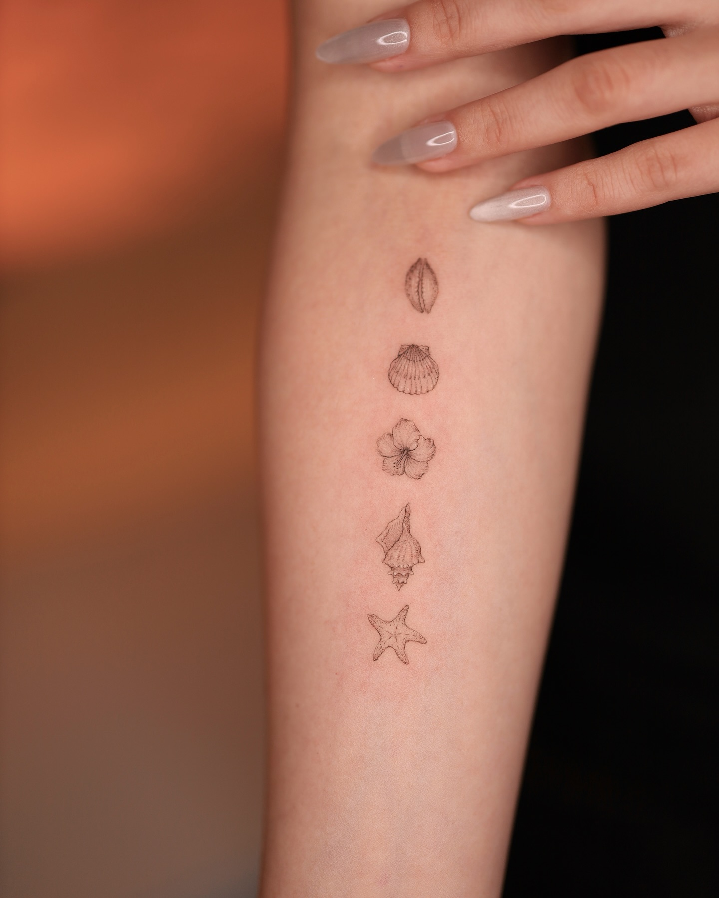 A series of small ocean-themed tattoos, including shells and a starfish, creates a whimsical design along the forearm.