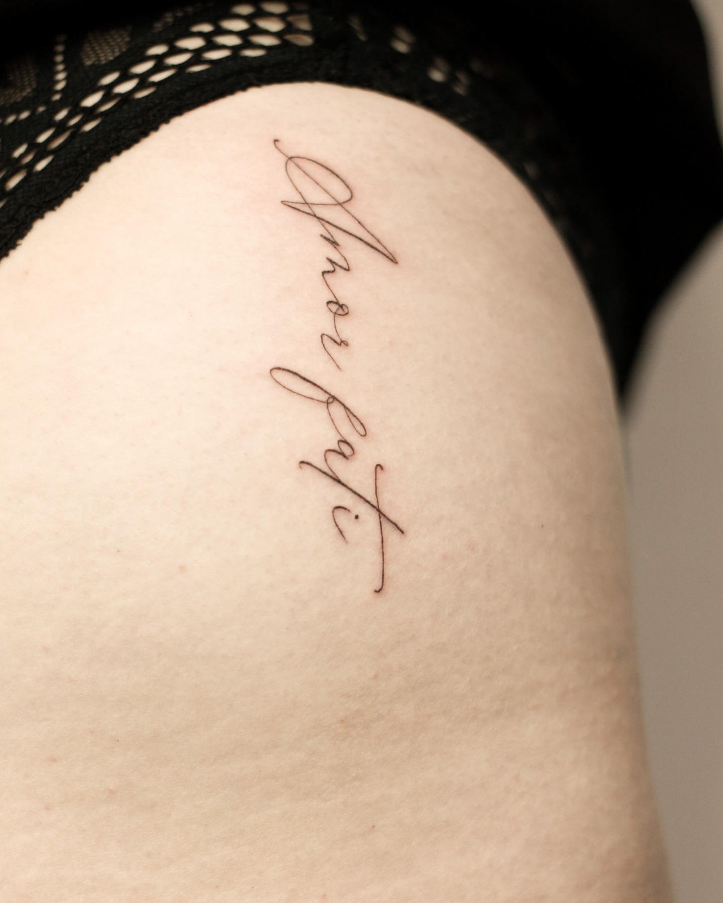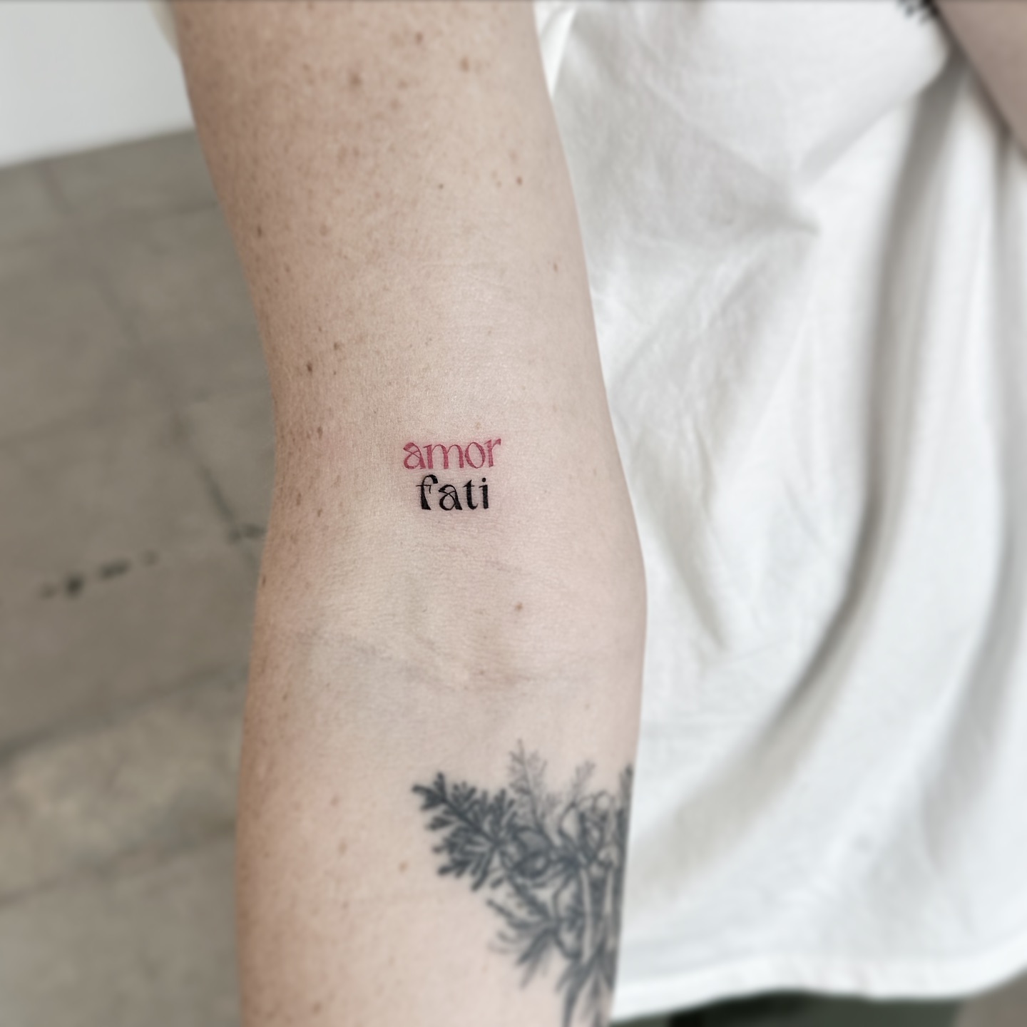 The tattoo features the phrase “amor fati,” where the word “amor” is highlighted in red while “fati” is in black.