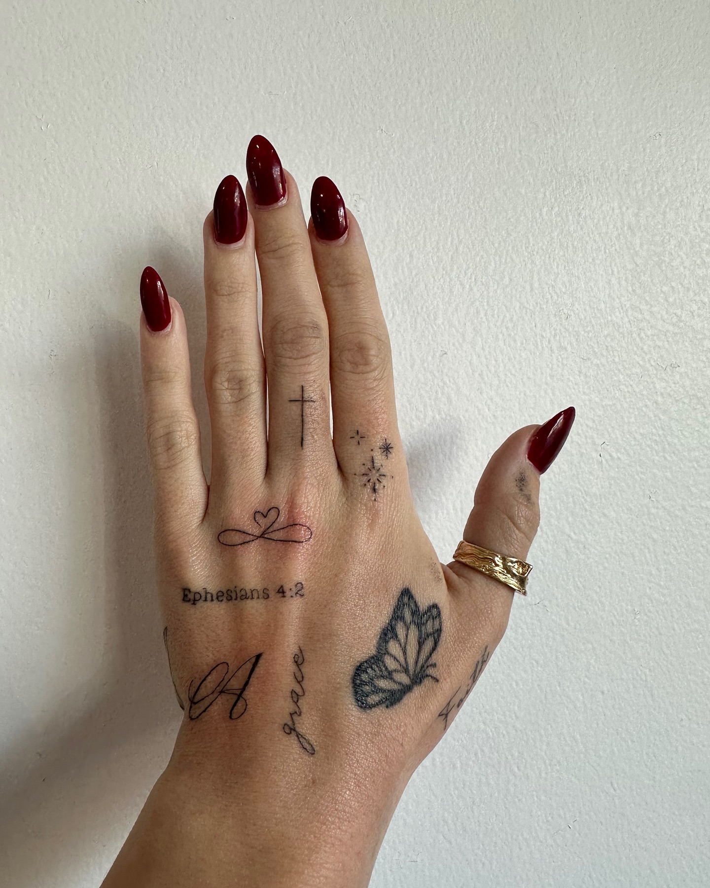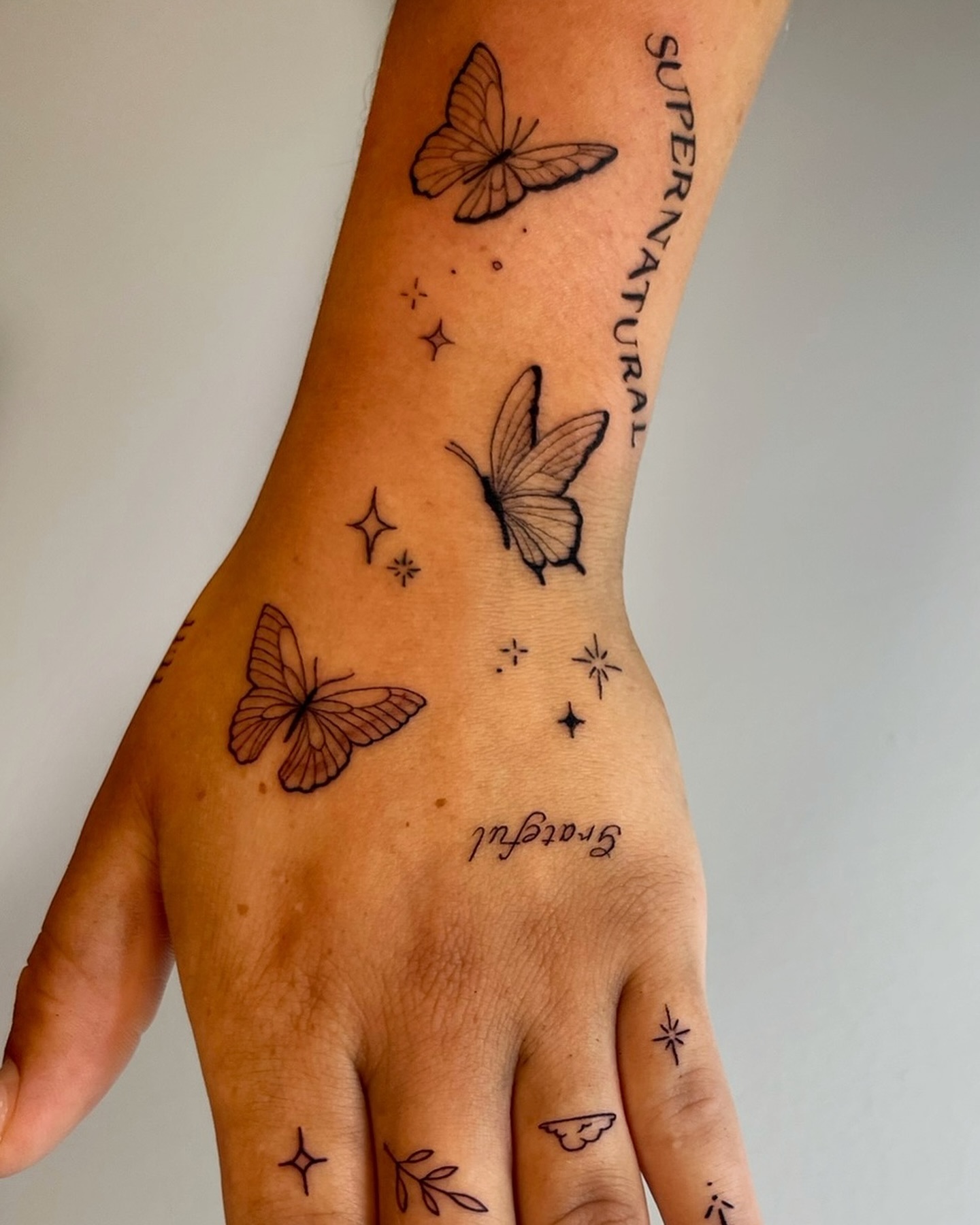 The delicate butterflies in varying sizes are the standout elements on this hand tattoo.