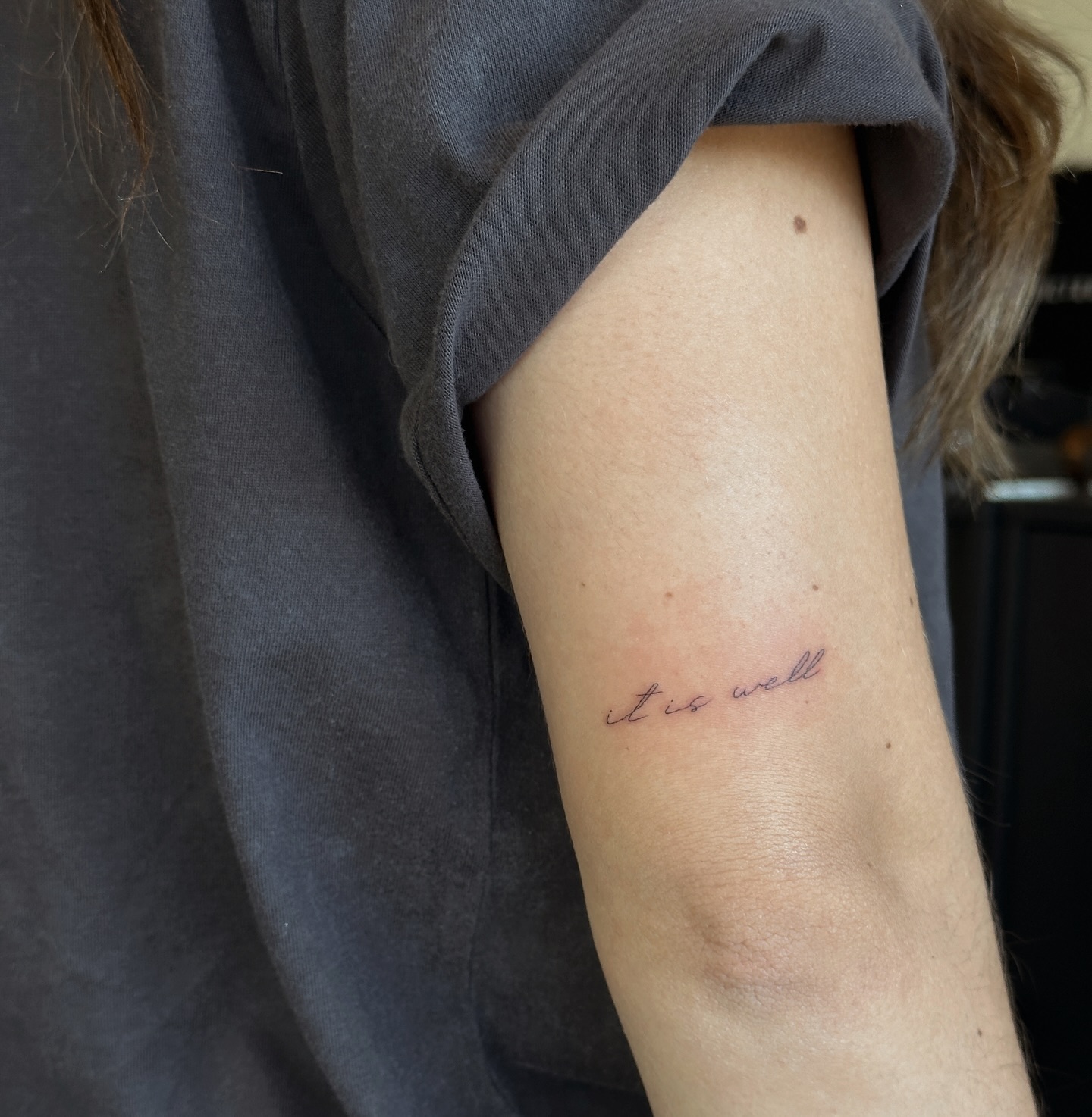 The tattoo features a soft, handwritten phrase that reads “it is well,” elegantly inked along the forearm.