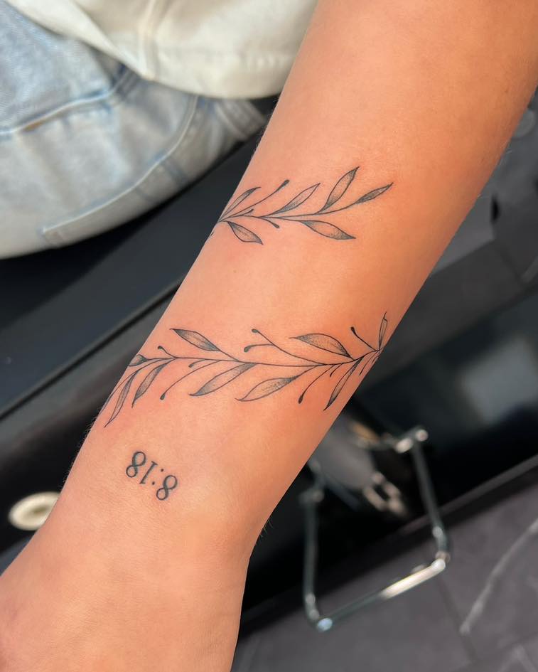 The tattoo features a delicate curved floral design intertwined with slender leaves, creating a graceful flow along the arm.