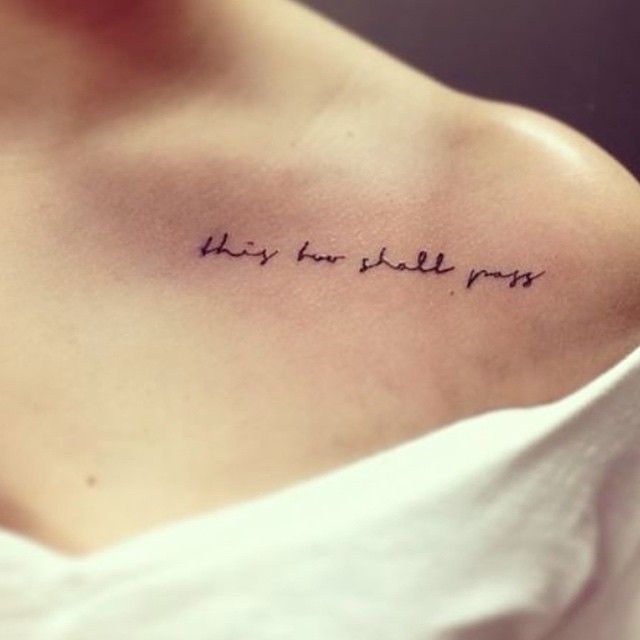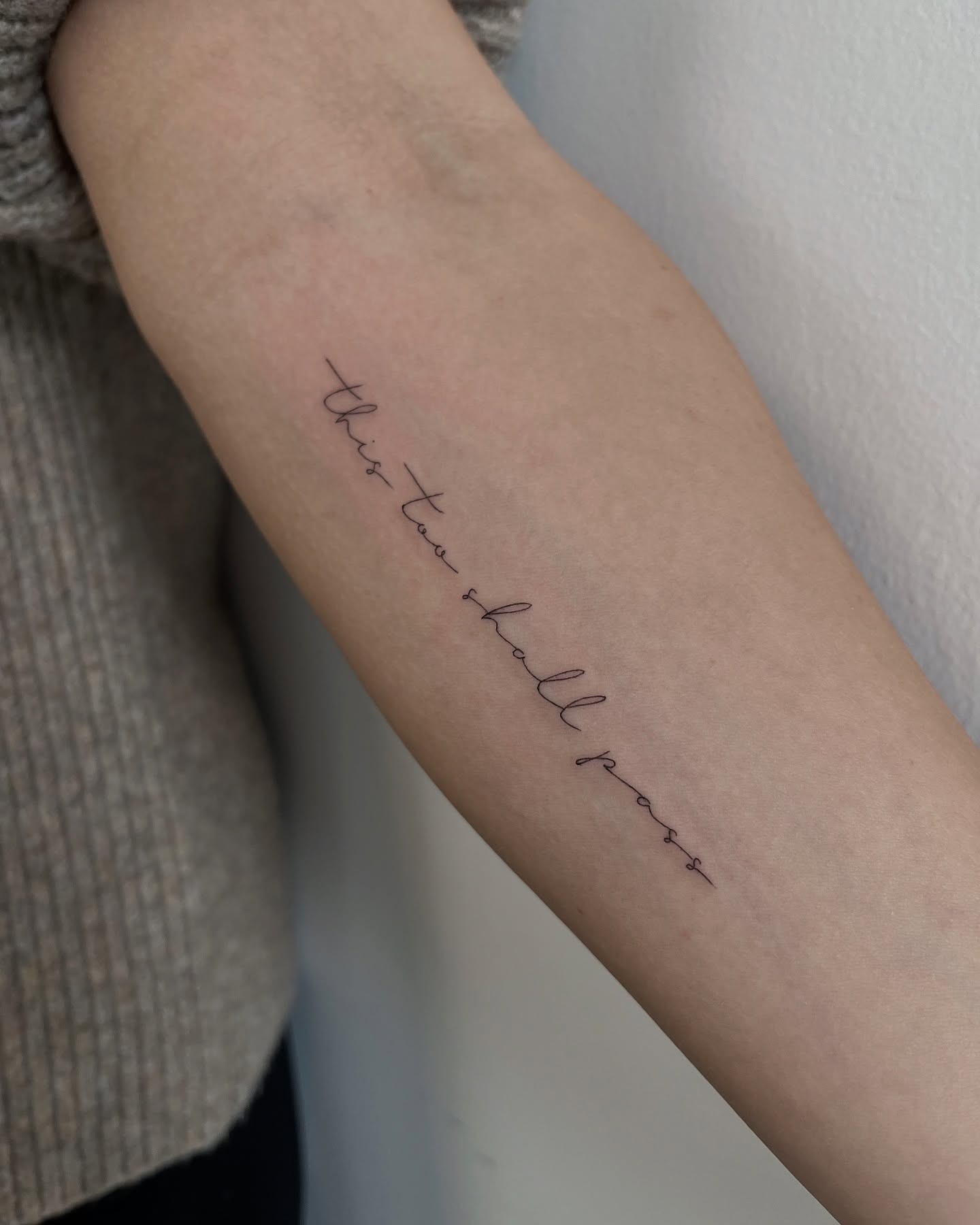 The tattoo features a flowing script that reads “this too shall pass,” elegantly inked along the inner forearm.