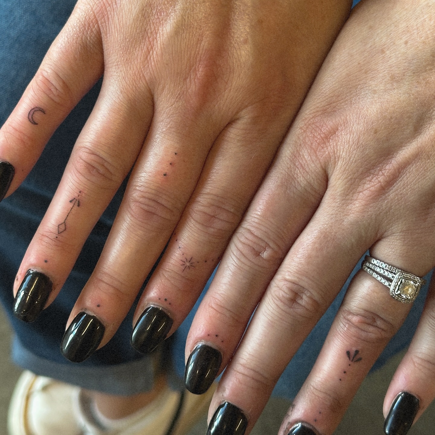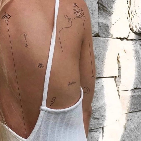 These tattoos use fine lines and minimal shading, allowing each element to stand out while maintaining a cohesive look through their delicate arrangement.