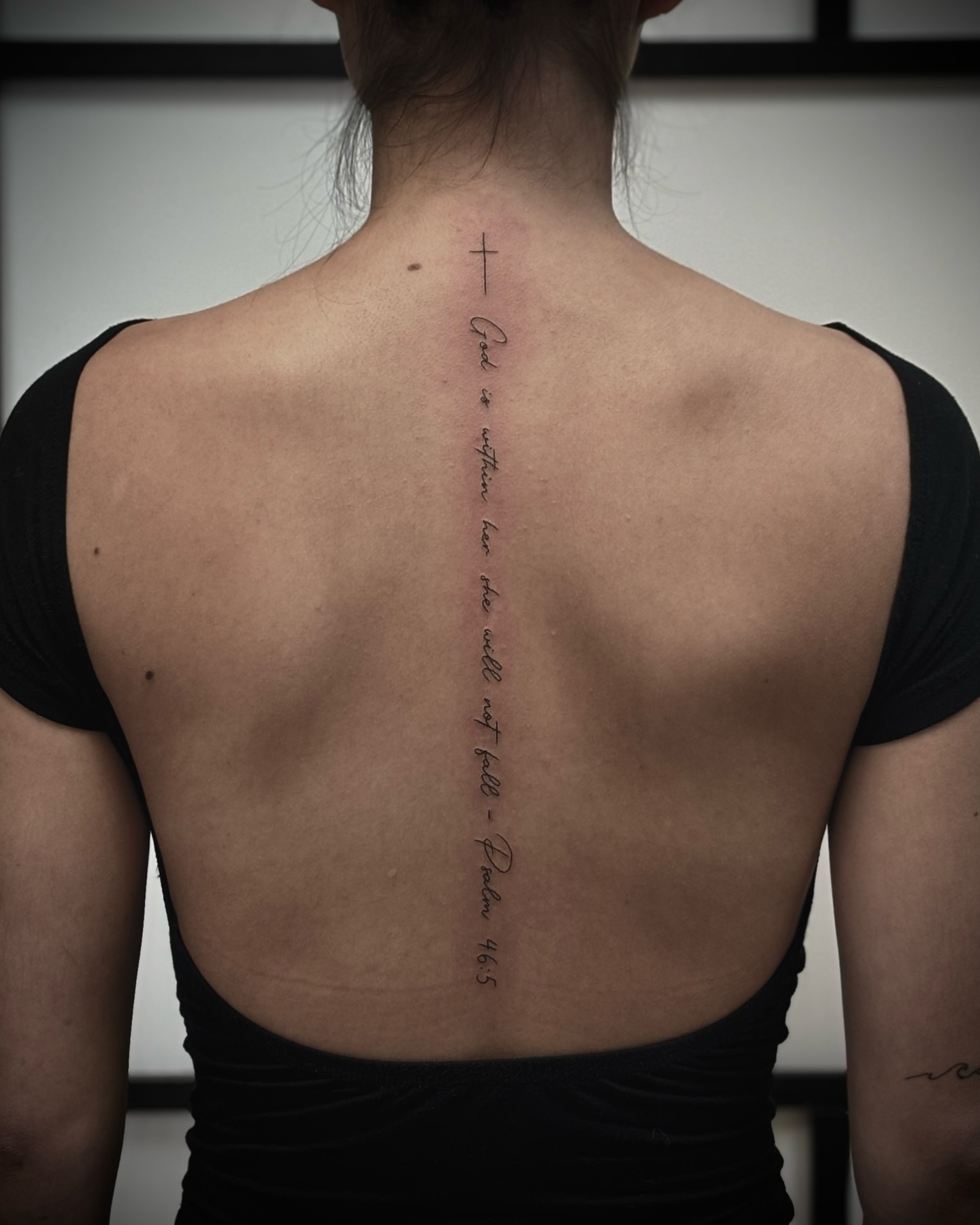 A slender tattoo featuring a vertical script and a small cross stands out on the back.
