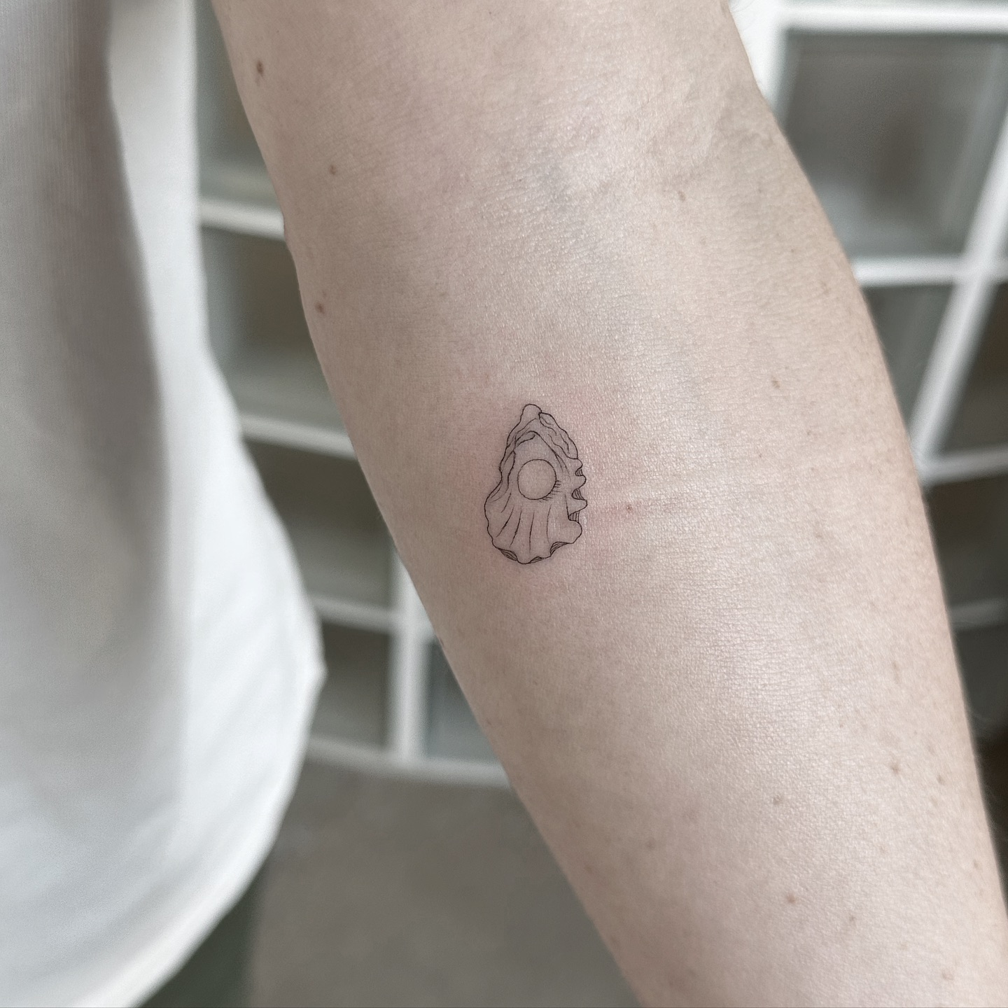 The tattoo features a finely detailed shell with a small circle at its center, showcasing intricate line work.