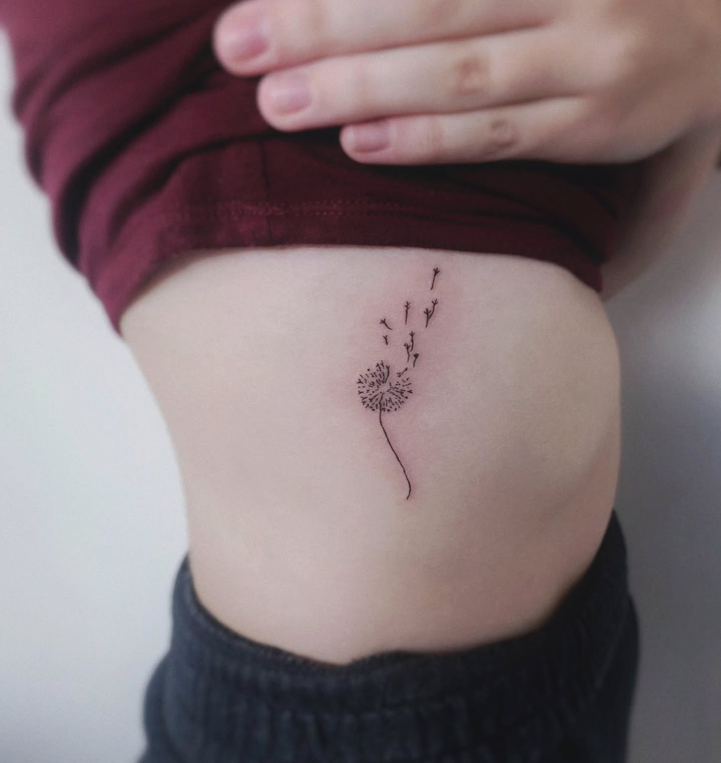 The delicate dandelion tattoo features intricate details, showcasing a fluffy seed head with several seeds appearing to float away.