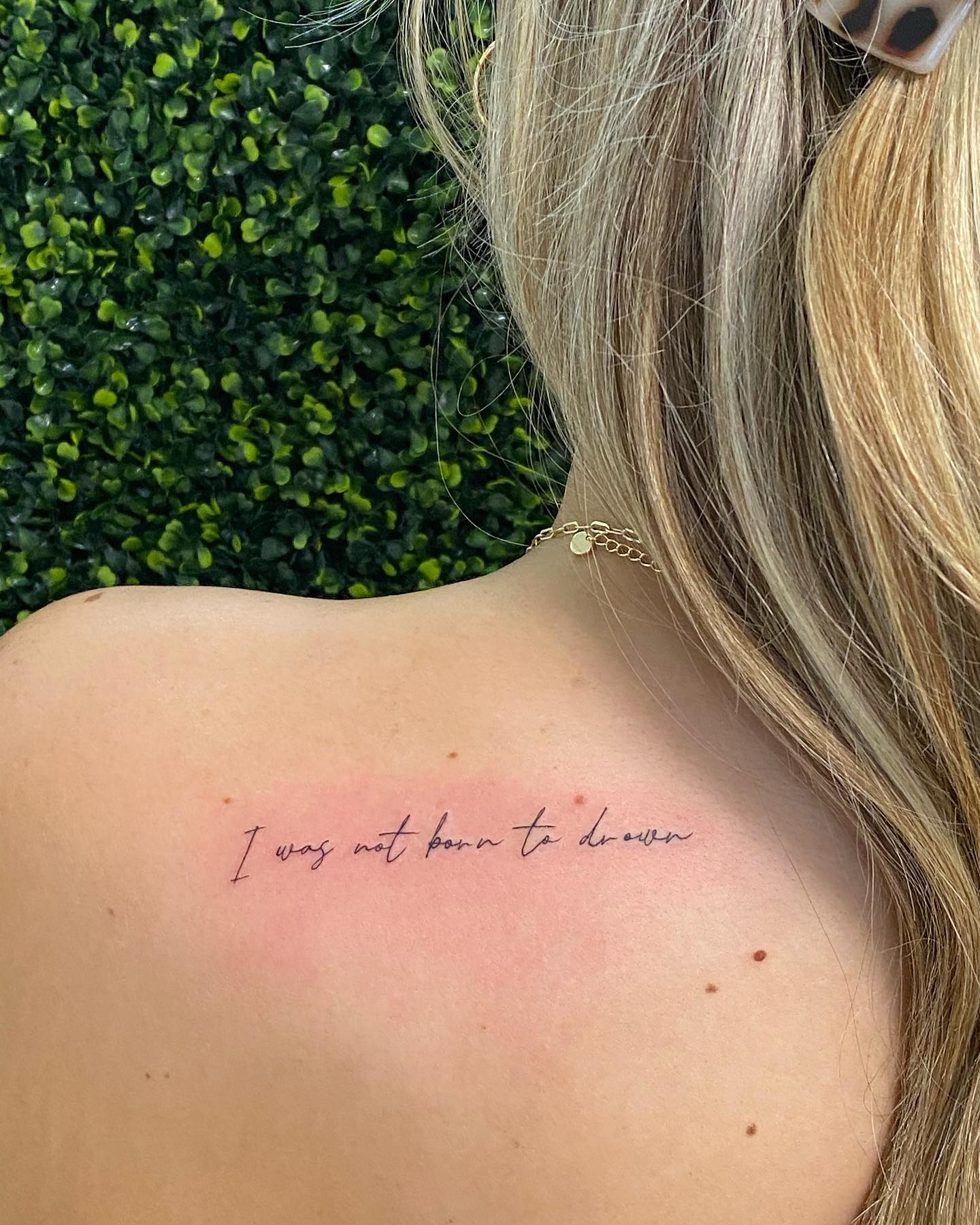 A delicate script tattoo elegantly sprawls across the shoulder, featuring the phrase “I was not born to drown.