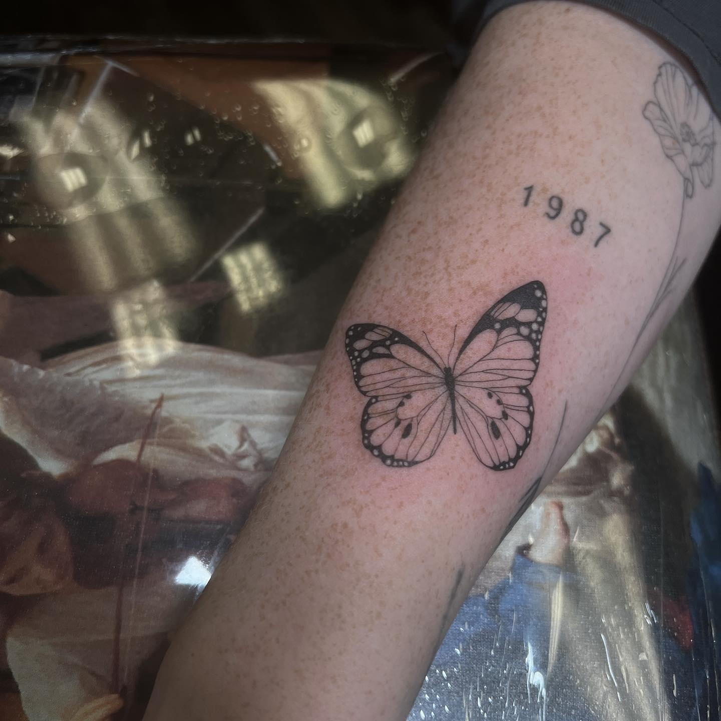 The butterfly tattoo features intricate line work that highlights its graceful wings and delicate structure.