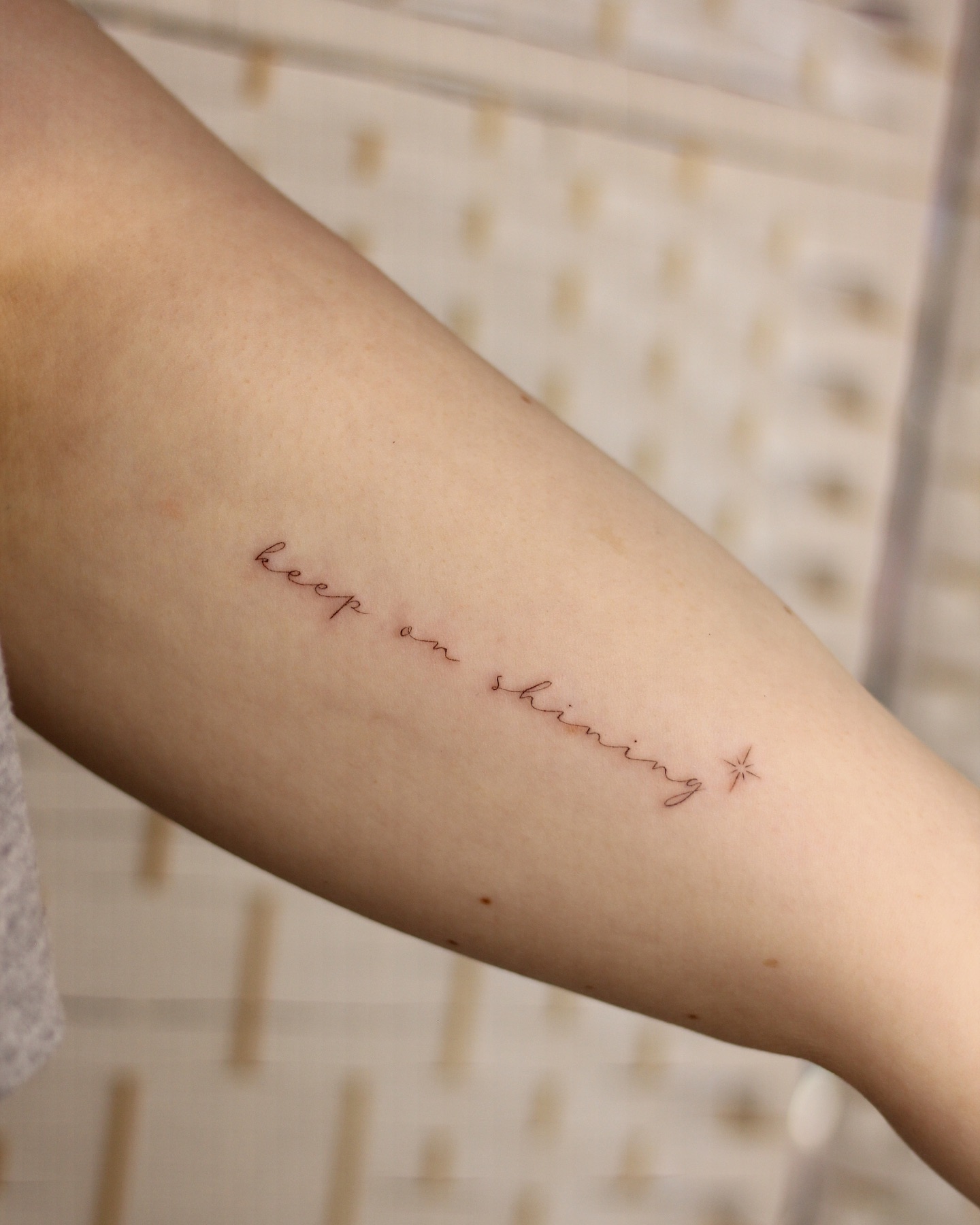 The delicate lettering of “keep on shining” flows gracefully along the skin, complemented by a small star at the end.