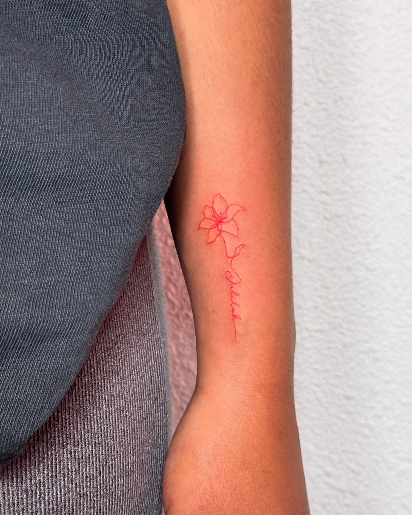 A simple yet elegant flower tattoo is complemented by flowing script that adds a personal touch.