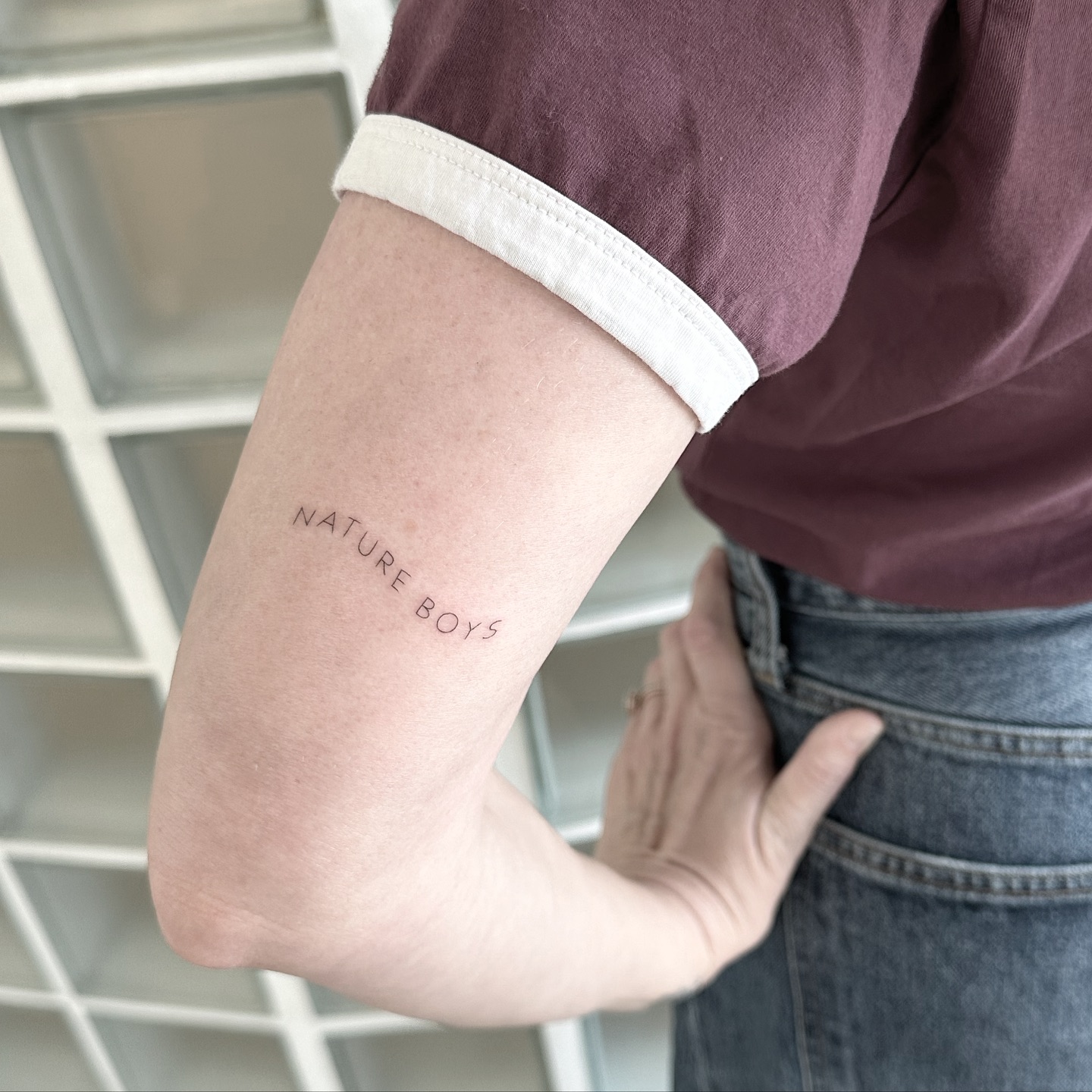 The tattoo features the phrase “NATURE BOYS” in a clean, minimalist font that emphasizes simplicity.