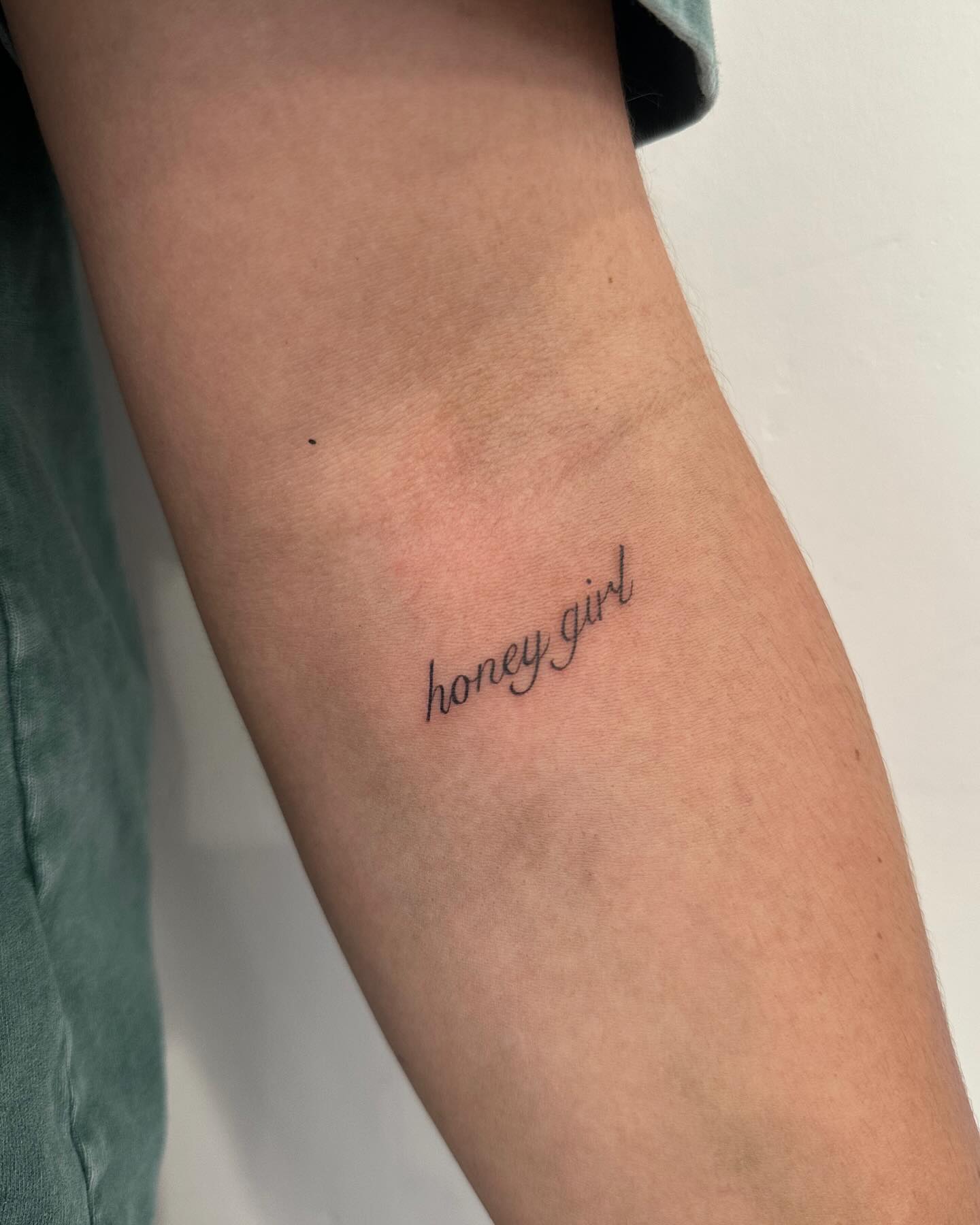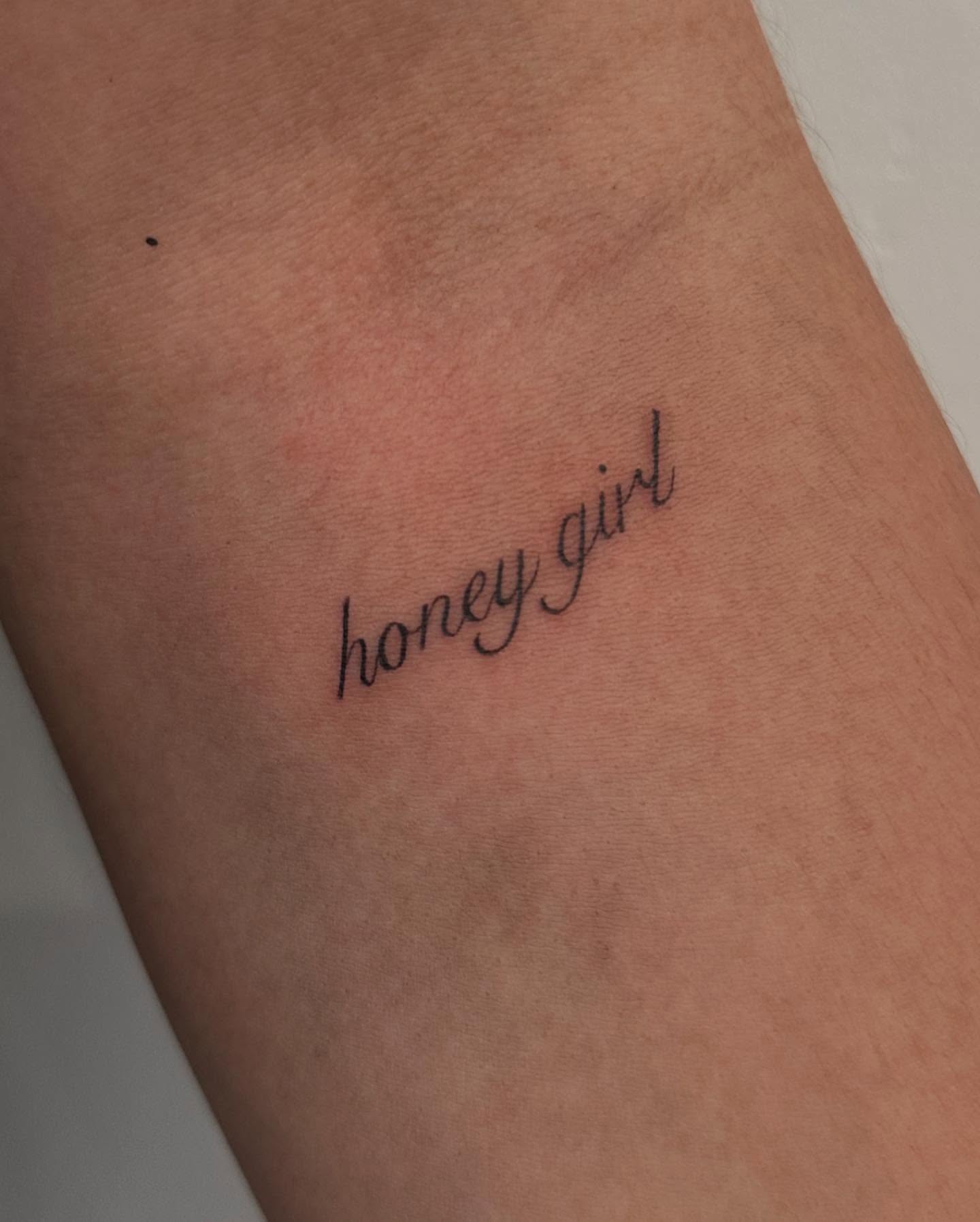 The tattoo features the phrase “honey girl” in a delicate, flowing script that adds a personal and intimate feel.