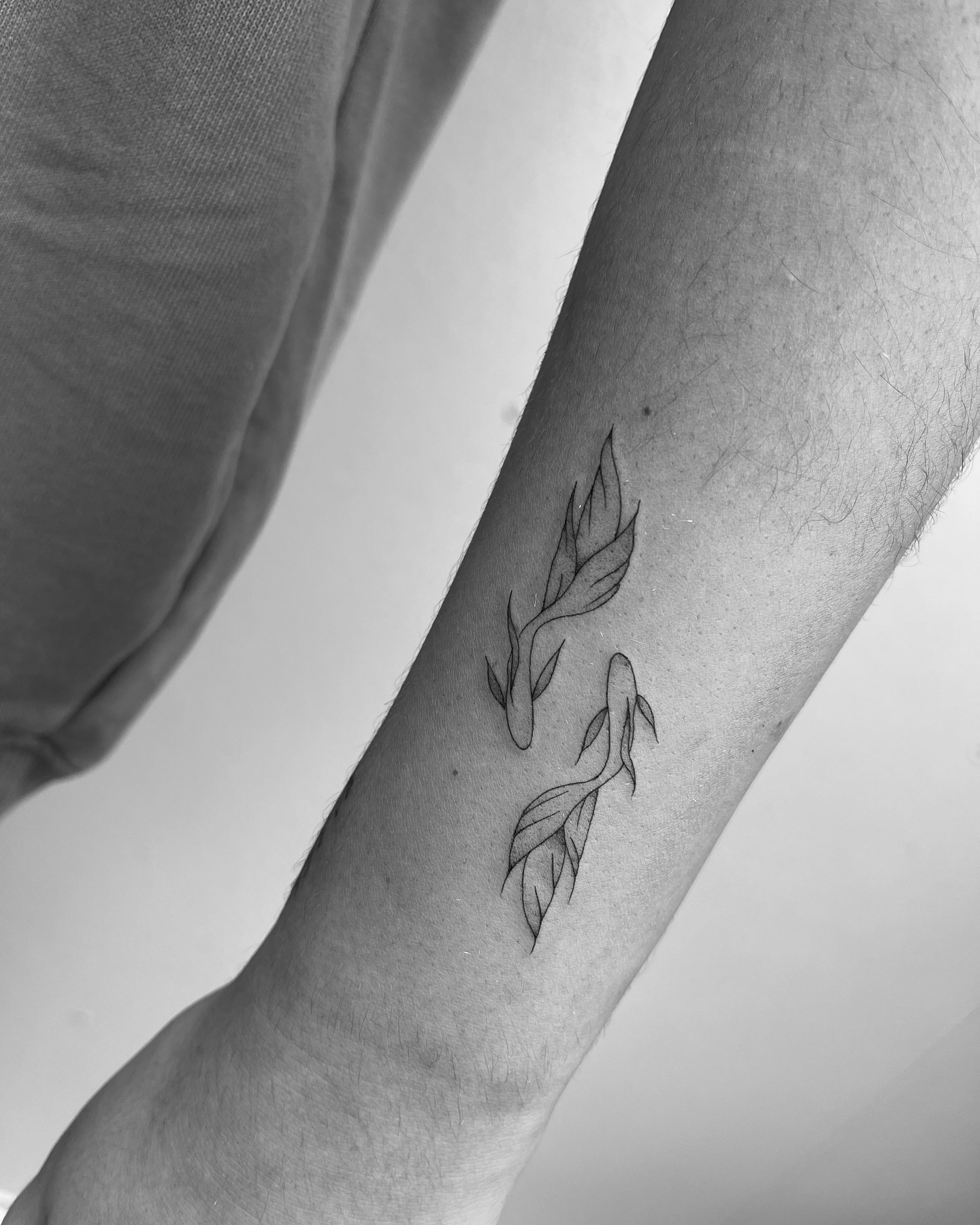 The tattoo features two elegantly designed fish intertwined with delicate leaf elements.