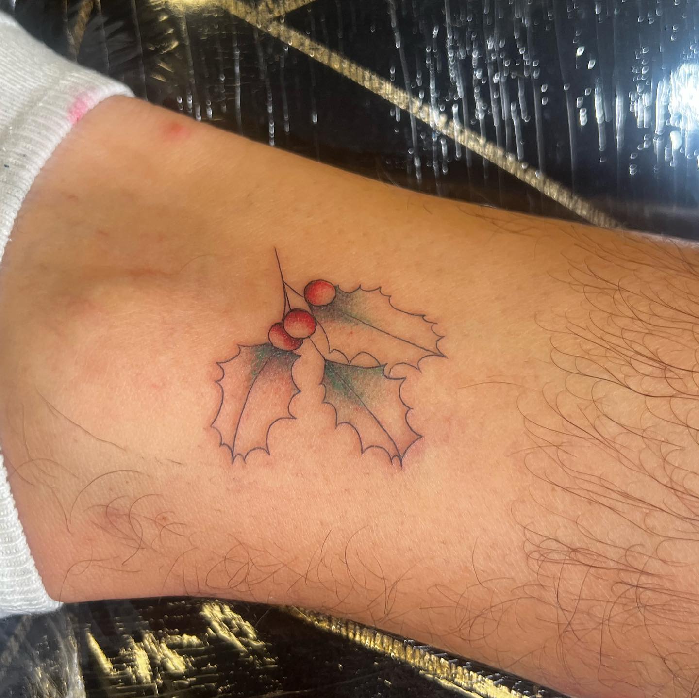 The delicate holly leaves and vibrant red berries create a festive design that stands out on the skin.