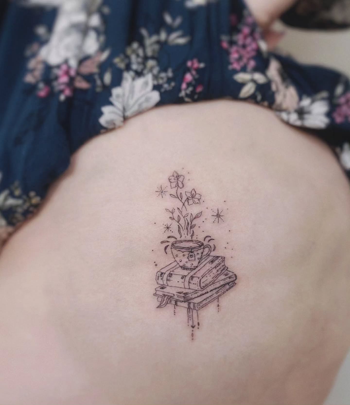 The tattoo features a delicate stack of books topped with a charming teacup filled with flowers.