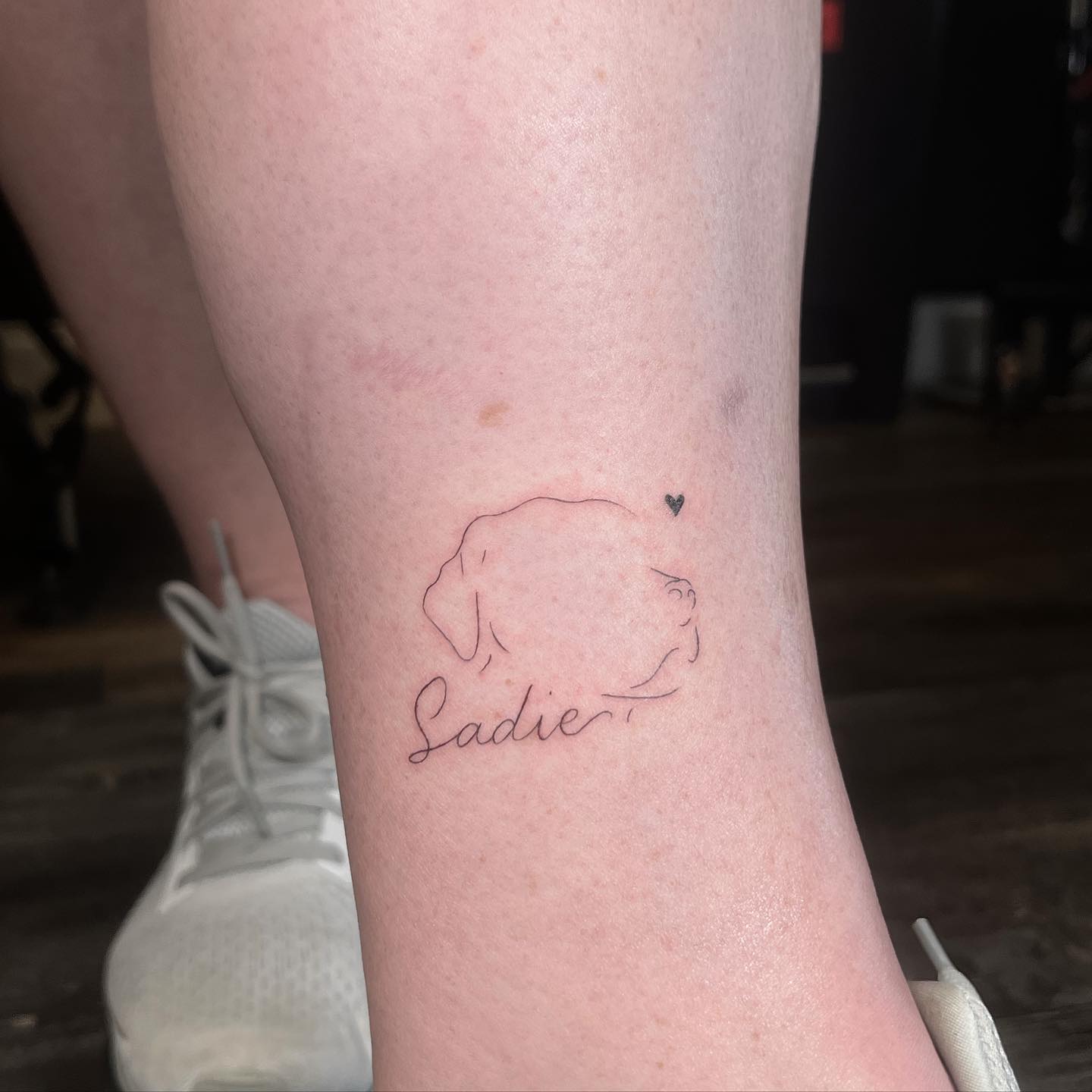 This simple yet effective design uses fine lines to capture the dog’s likeness, while the flowing script adds an emotional touch.