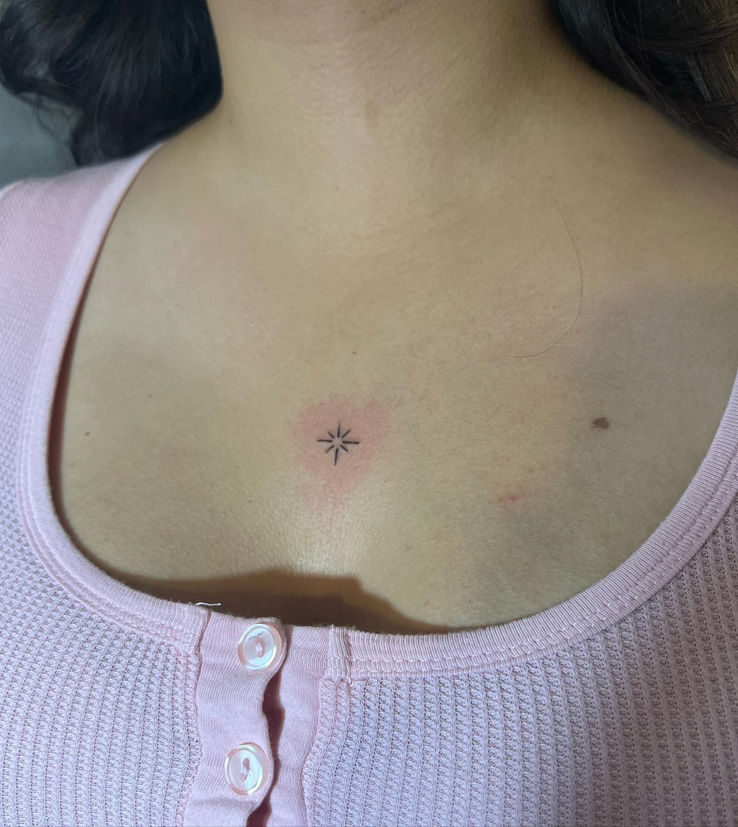 A small, minimalist star tattoo stands out against the skin’s subtle pink tone.
