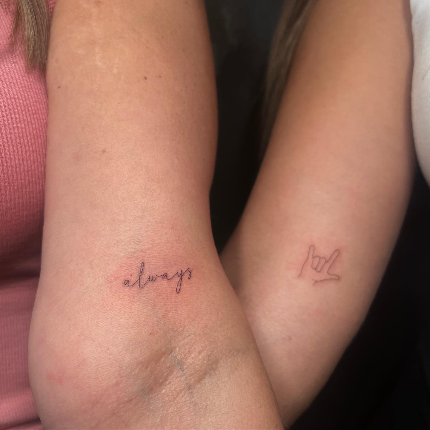 The tattoo features the word “always” in a delicate script alongside a simple sign language gesture.