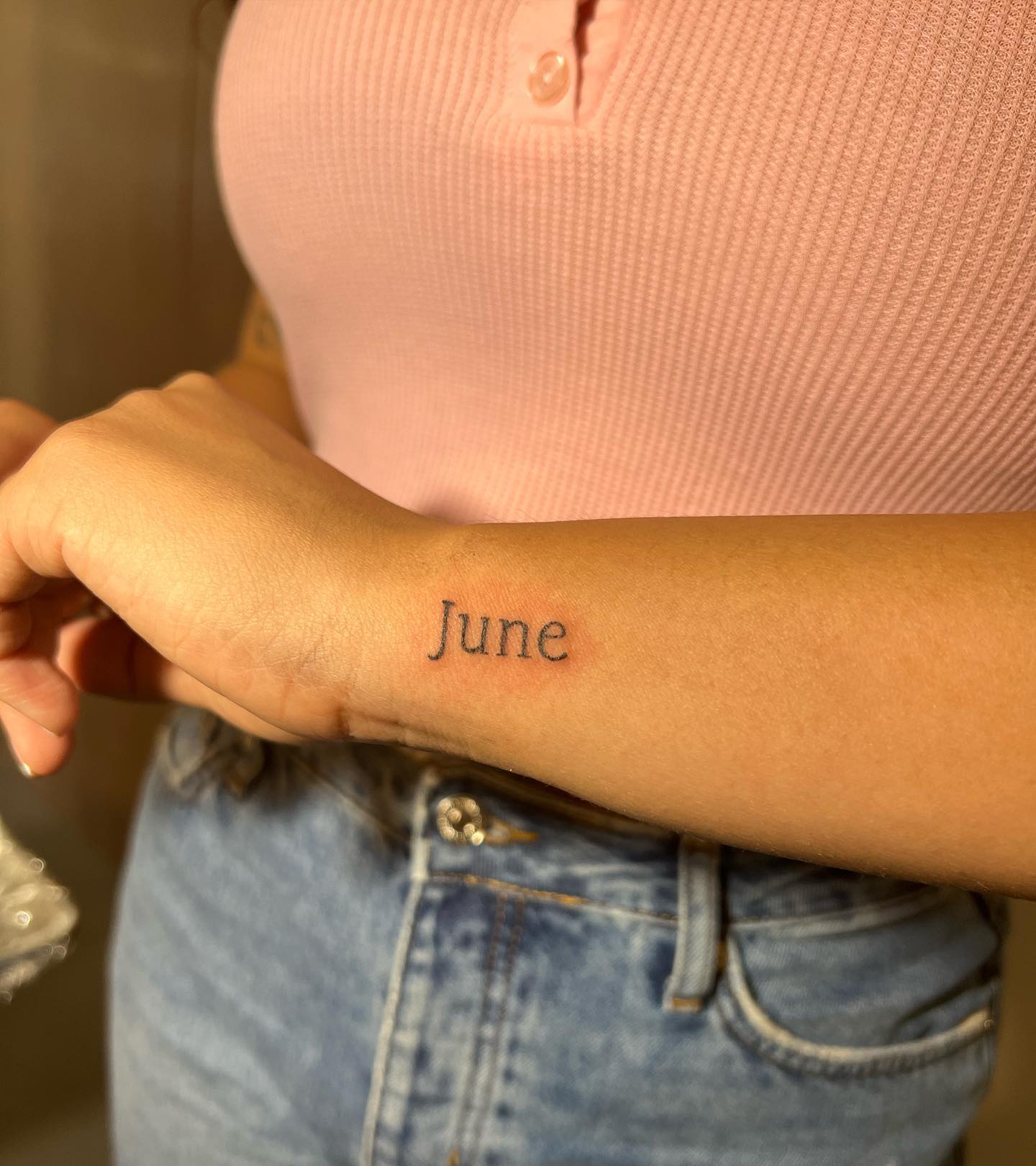 The tattoo features the word “June” in a clean, elegant script that stands out on the skin.
