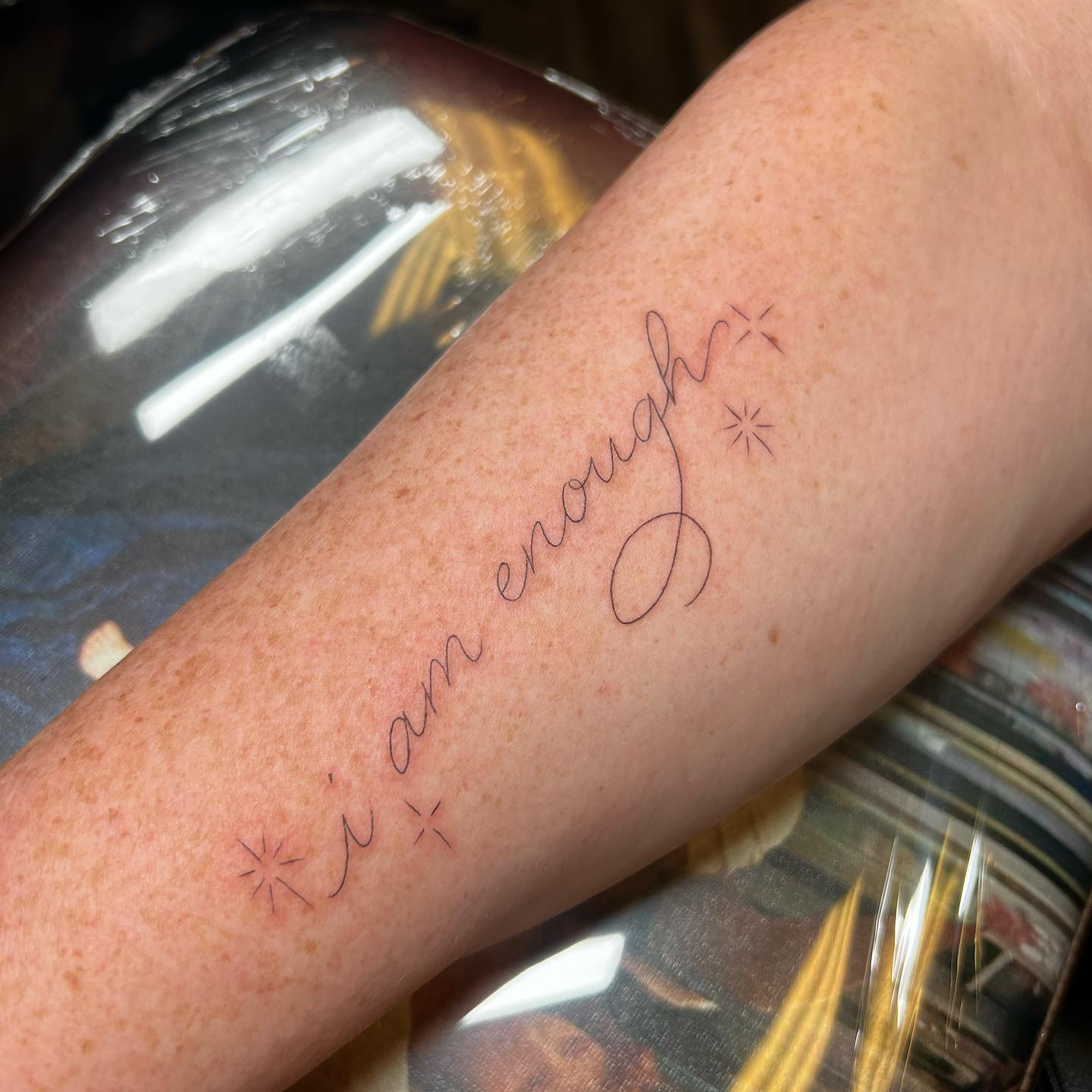 The tattoo features a soft, flowing script that reads “i am enough,” highlighted by small star accents.