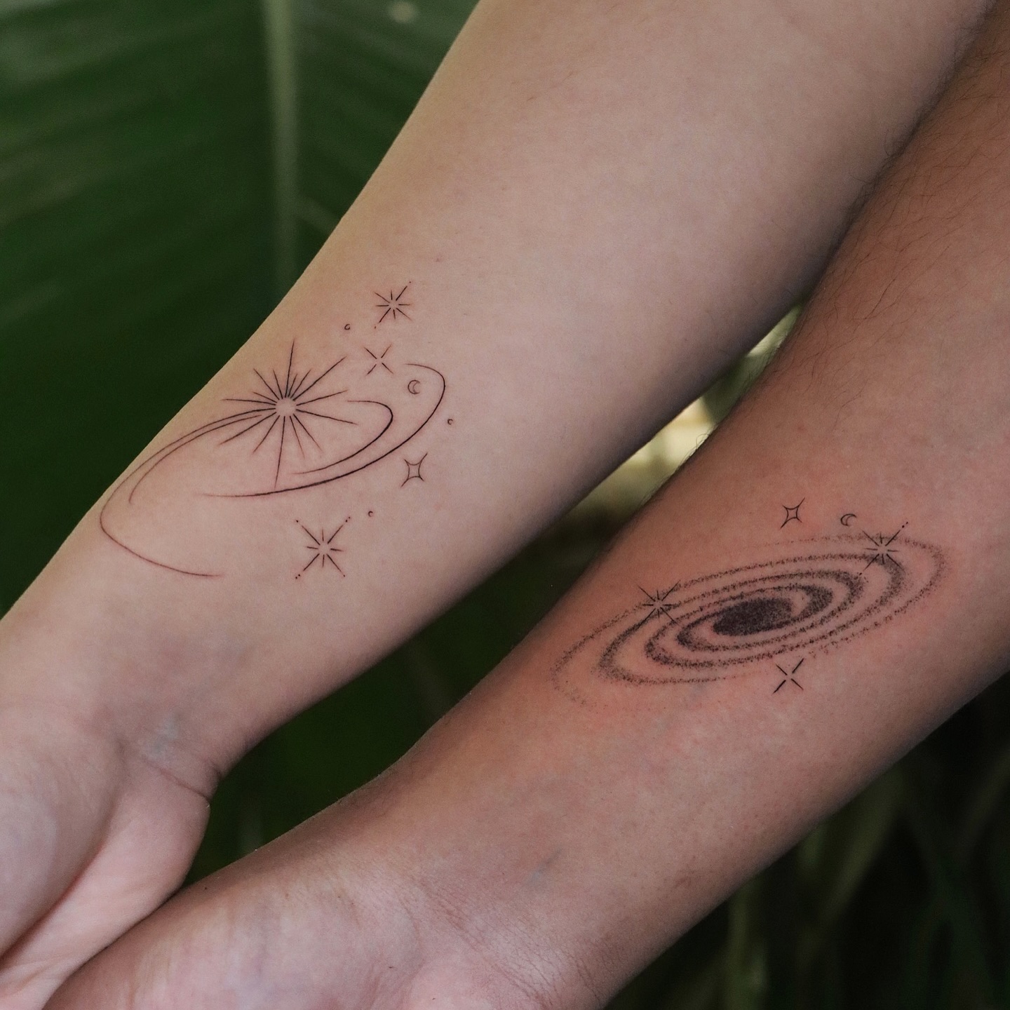 This image showcases two stunning tattoos that capture the beauty of the universe with delicate designs of galaxies and stars. The fine lines and intricate details create a charming look, making these tattoos a perfect choice for those who love to express their connection to the cosmos. When choosing a tattoo, consider picking a theme that resonates with you, as it can make the artwork even more meaningful.