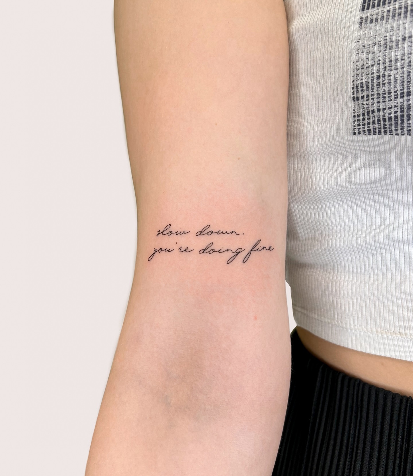 This tattoo features a beautiful phrase that says, “slow down, you re doing fine,” elegantly inked on the arm. Its simple yet powerful message serves as a gentle reminder to take things at a comfortable pace. A tattoo like this can be a wonderful way to express personal growth and self-care in style.