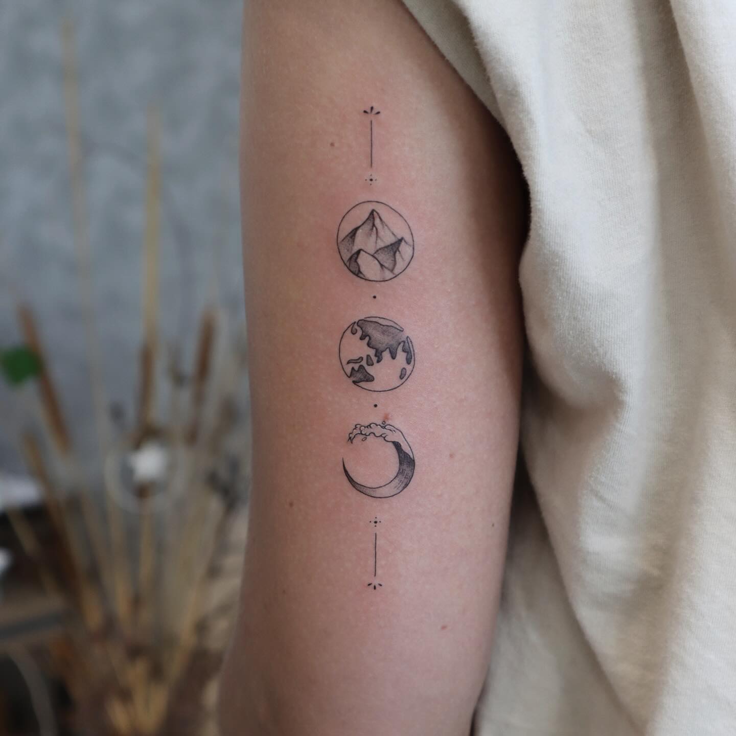 This tattoo design beautifully captures the essence of nature with its delicate symbols of mountains, the Earth, and ocean waves. Each element is thoughtfully arranged, making the artwork both eye-catching and meaningful. For those considering fine tattoos, choosing designs that reflect personal values or experiences can make the artwork even more special.