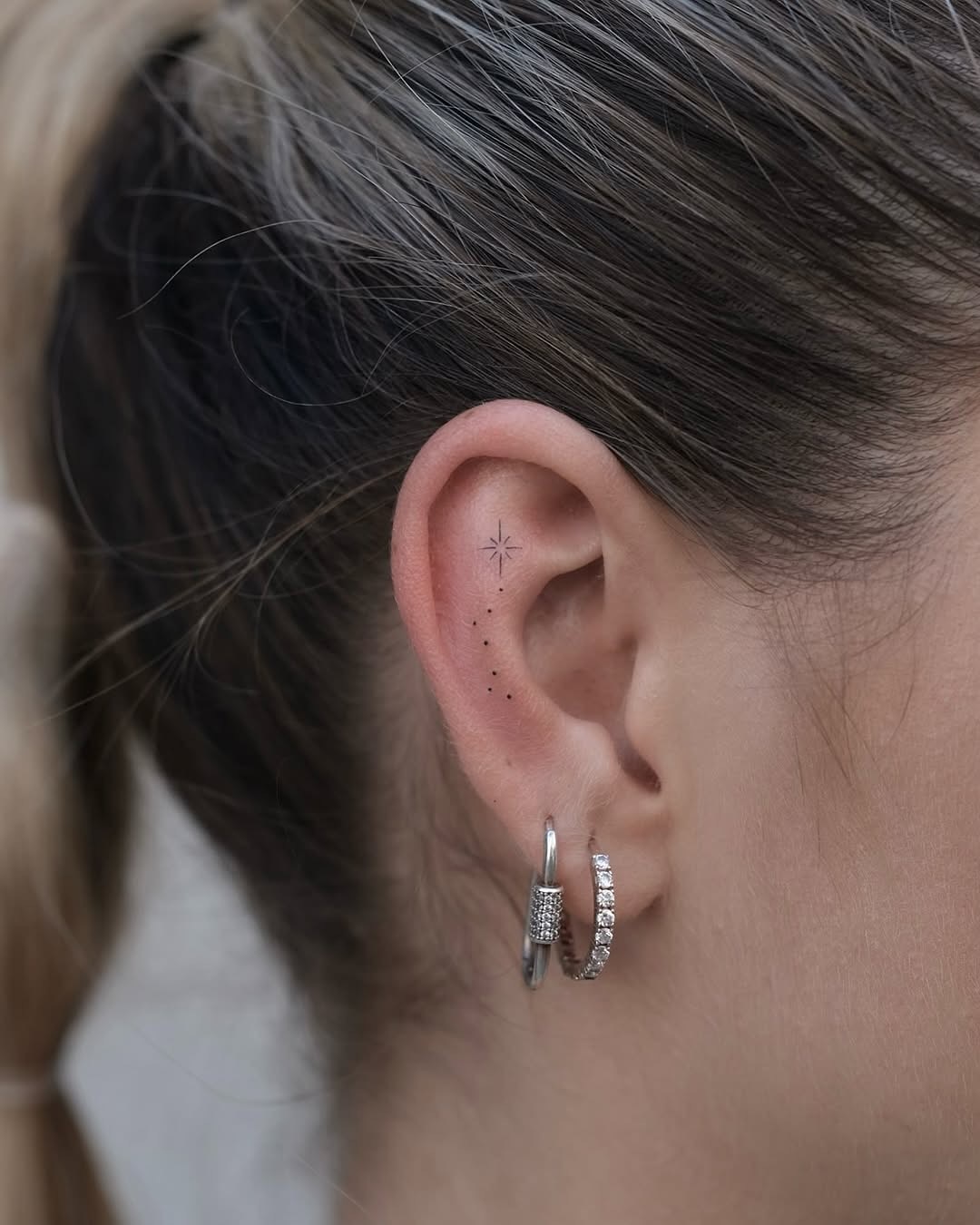 This image showcases a delicate tattoo placed near the ear, featuring a tiny star and subtle dots that add a touch of elegance. The simplicity of the design makes it an eye-catching choice for those who appreciate fine tattoos. A great tip for anyone considering a similar tattoo is to choose a location that feels personal, allowing the piece to feel even more special.