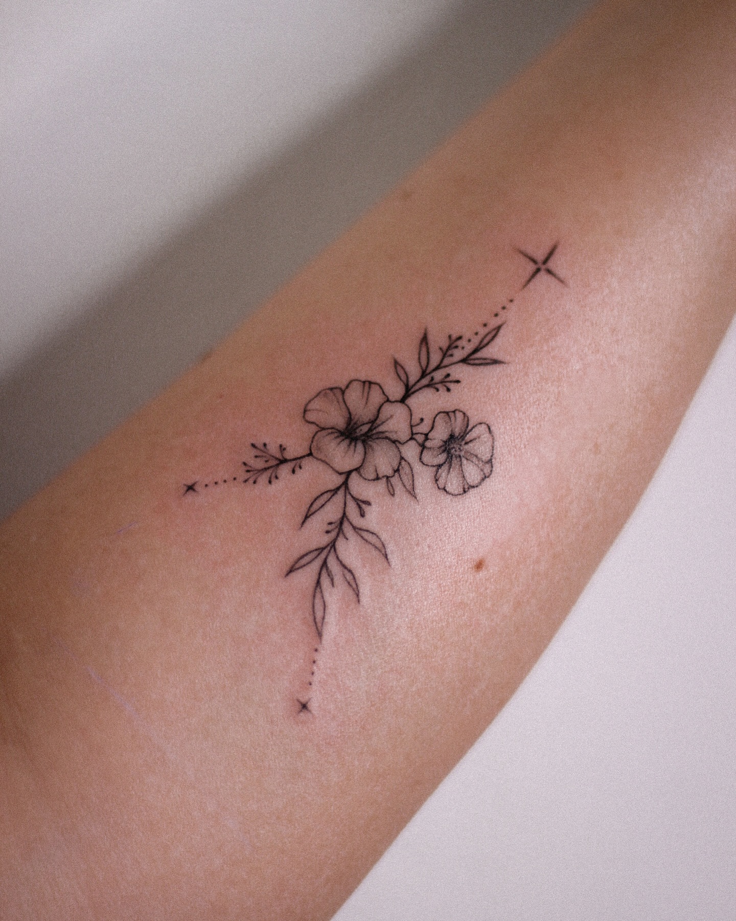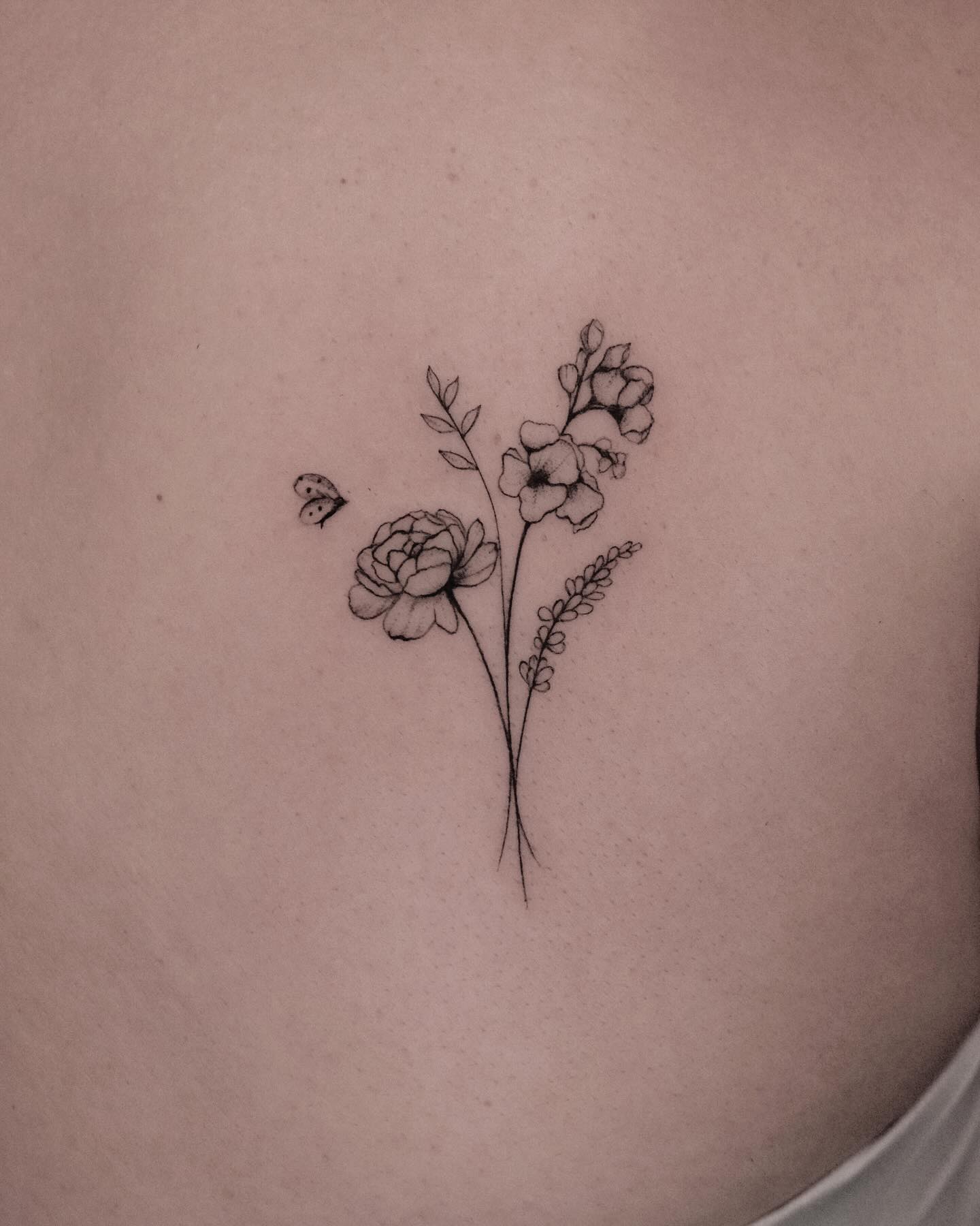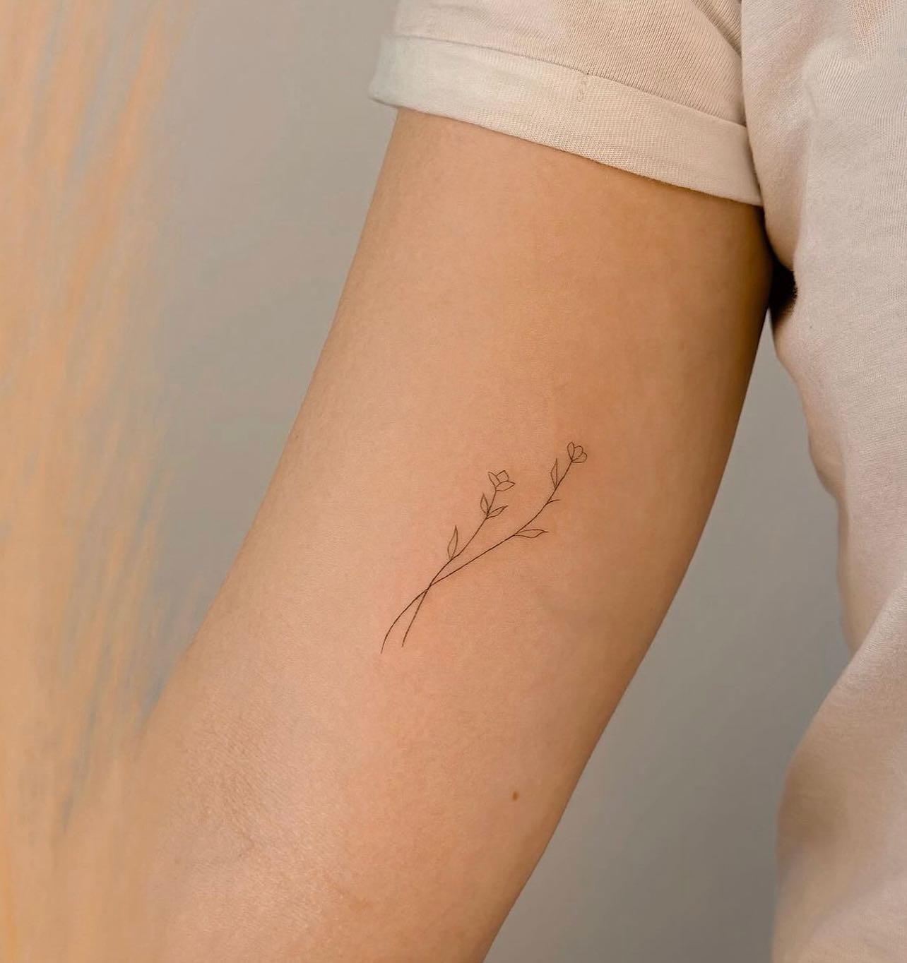 This tattoo showcases delicate flowers that bring a touch of nature to the skin. The soft lines and gentle details create an inviting and cheerful vibe, making it a perfect choice for those who appreciate subtle art. Choosing fine tattoos like this can express personality in a beautiful way, reminding wearers of the simple joys in life.