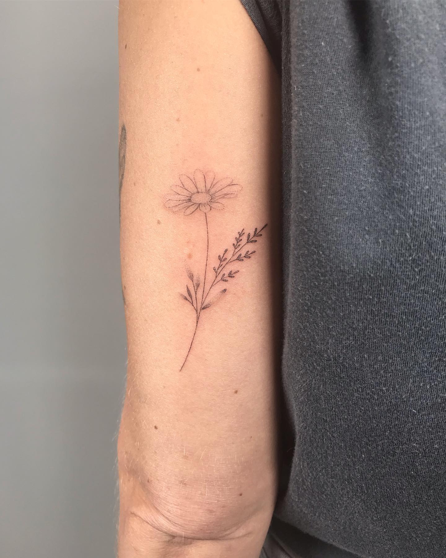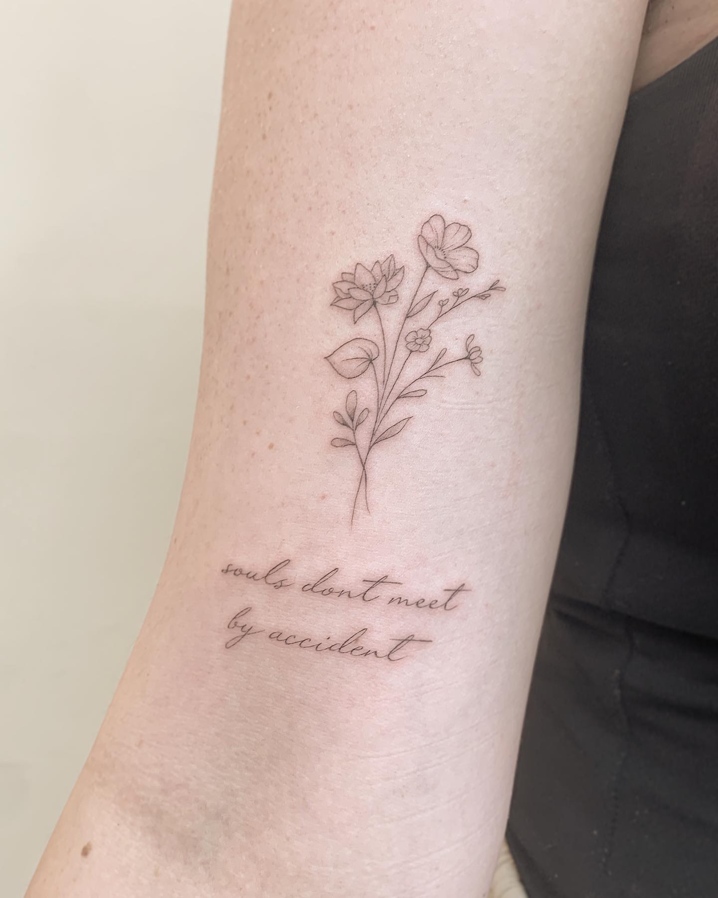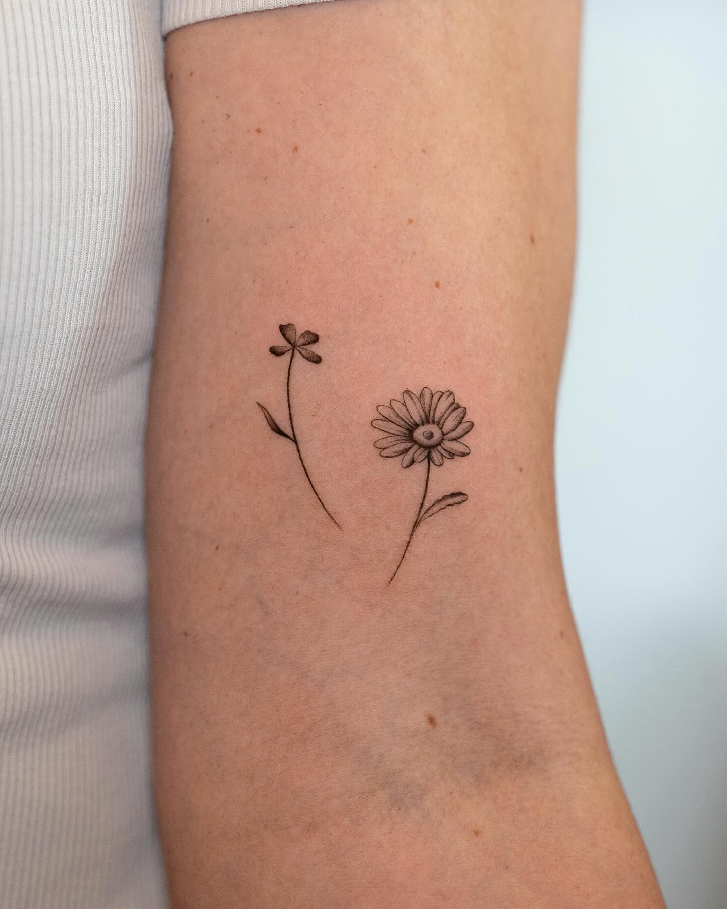 This tattoo showcases delicate flowers that bring a touch of nature to the skin. The soft lines and gentle details create an inviting and cheerful vibe, making it a perfect choice for those who appreciate subtle art. Choosing fine tattoos like this can express personality in a beautiful way, reminding wearers of the simple joys in life.
